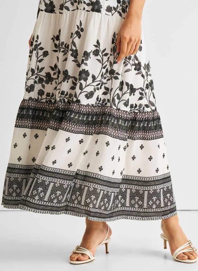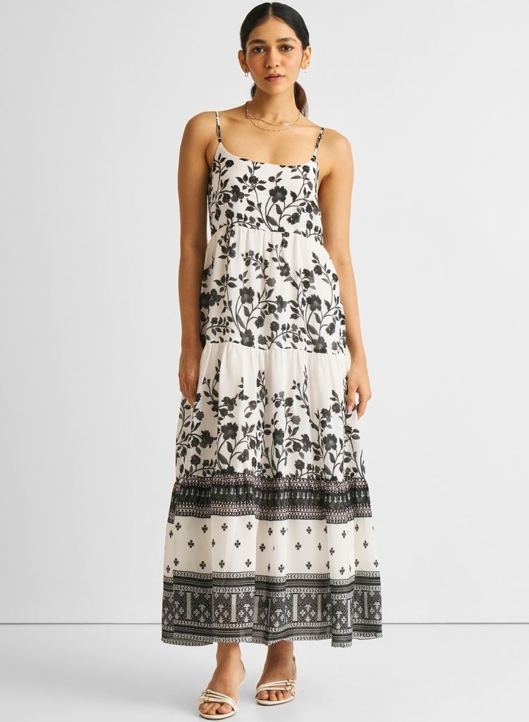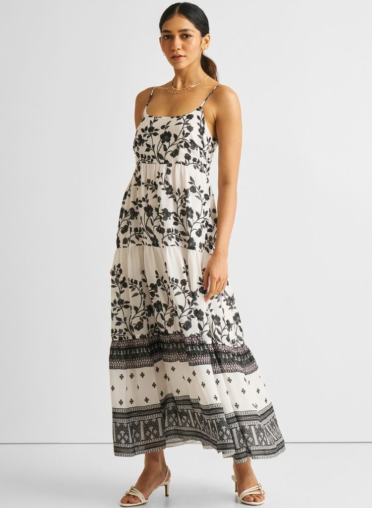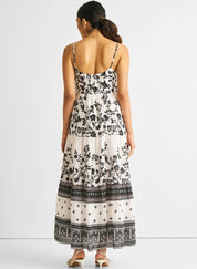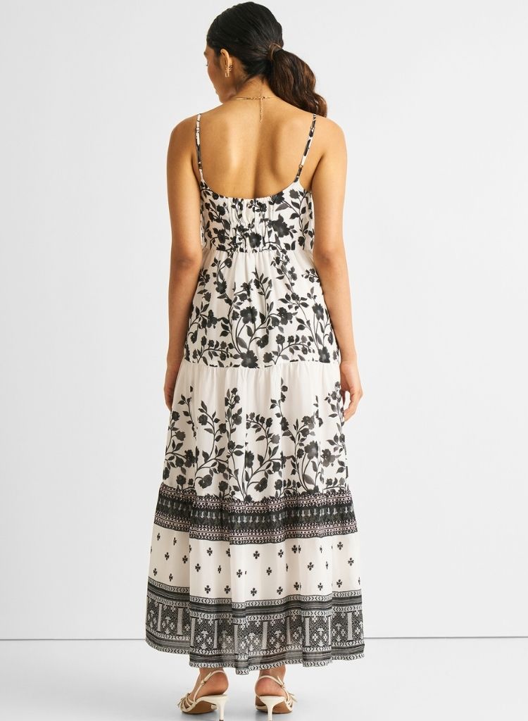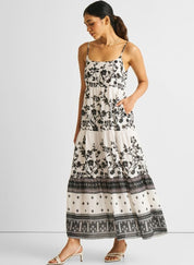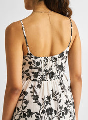 A floral maxi dress featuring a wide neck, adjustable straps and inseam pockets. Length 52"-54" based on size. The model is 5'9" and is wearing a size XS.