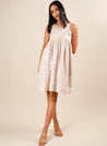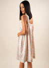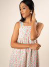 A floral hand block printed mini dress featuring wide straps, a square neck and inseam pockets. The model is 5'7" and is wearing size XS.
