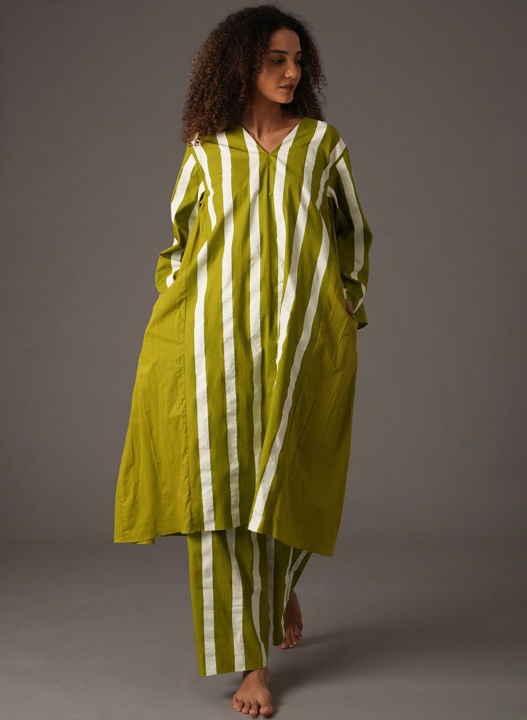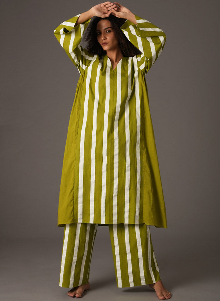 A two piece set pairing the Stripe V-Neck Dress and matching pants. The striped relaxed fitting midi dress features a V-neck, kimono sleeves and inseam pockets. Length 44". The matching pants feature an elasticated waist and inseam pockets. Length 38". The model is 5'8" and is wearing a size S.