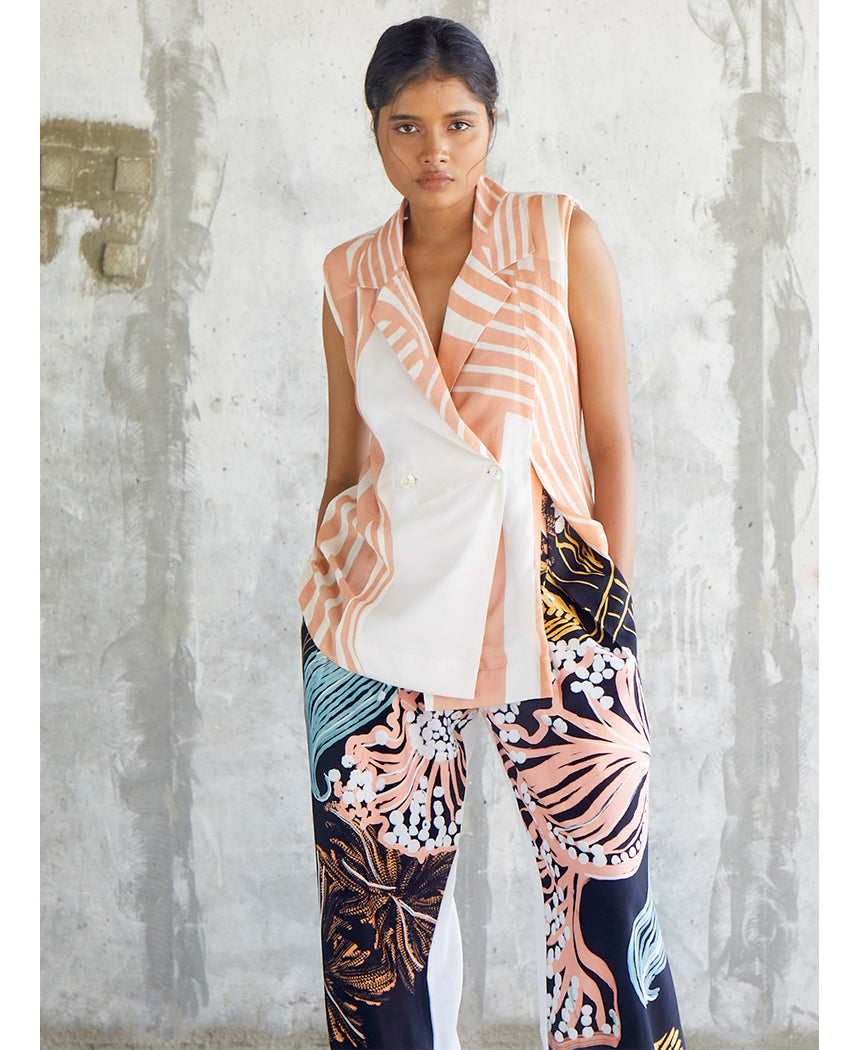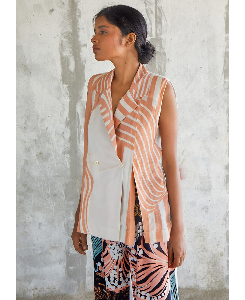 A sleeveless trench style top with a wavy stripe print and a front slit. Features a solid back, lapel collars and an overlap front. Length 25". The model is 5'5" and is wearing size S.