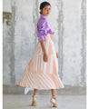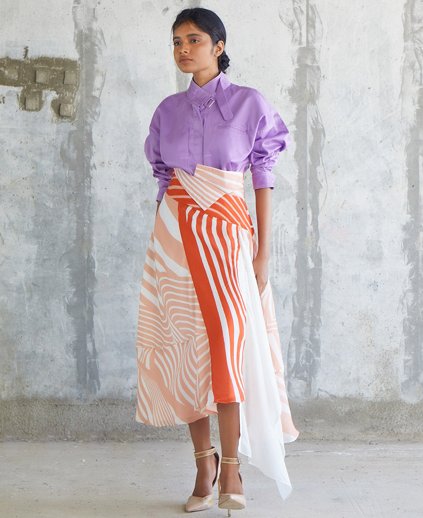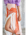 A fluid midi skirt with a wavy stripe print and handkerchief hem. Features an asymmetric buttoned slit and a concealed zipper. Front length 32", side length 40". The model is 5'5" and is wearing size S.
