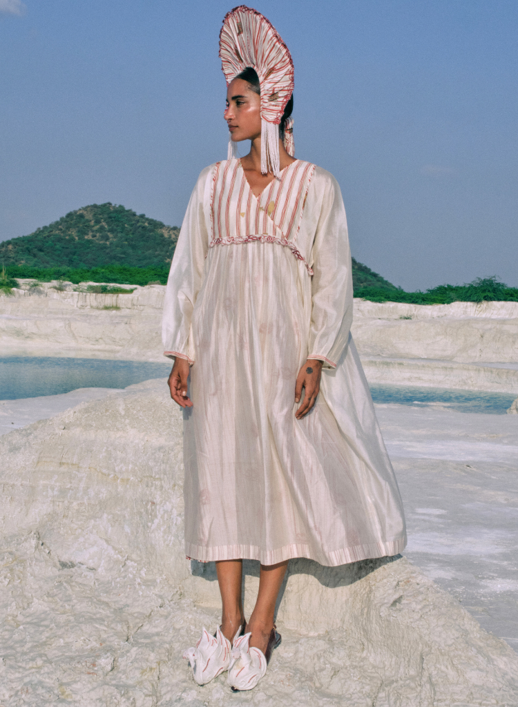 A relaxed fitting midi dress with overlapping hand-screen-printed yoke featuring hand-stitched beads and embroidered lace, while gathered sleeves finish with button-loop cuffs for subtle refinement. Length 47". The model is 5'8" and is wearing a size M.