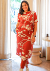 A printed midi dress with a round neck and short sleeves featuring a waist tie-up and side slits. Length 46". The model is 5'7" and is wearing size S.