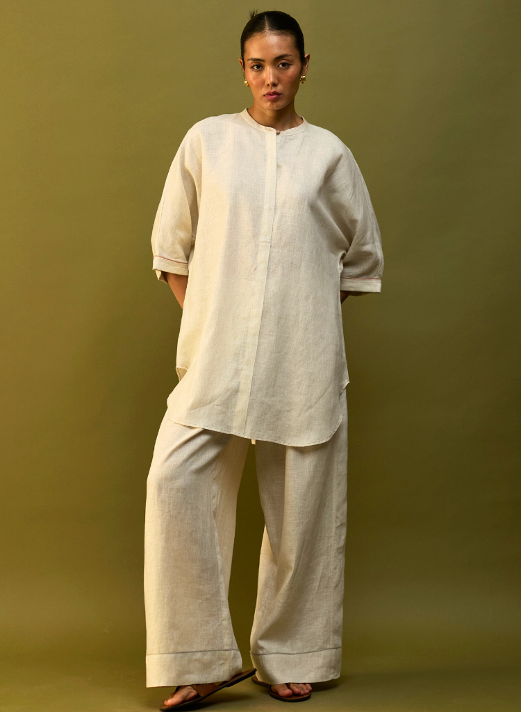 A two-piece set pairing the Sumire Curved Hem Top and the Mekko Pleated Trousers. The beautifully relaxed top with a round neckline, concealed placket with mother-of-pearl buttons, dolman sleeves, rounded hemline and folded cuffs is finished with delicate contrast linen edging and top-stitch detailing. The back has a contrast linen piping extending along the sleeve. The carefully pleated trousers are designed with pleats at the waistband, practical side pockets and a woven contrast selvedge detail at waistband and bottom hem. The model is 5'8" and is wearing a size S.