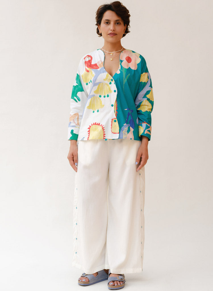 A two piece set pairing the Summer Wave Shirt and the Summer Wave Pants. The playfully printed lounge top with an asymmetrical neckline and 3/4th sleeves features delicate embroidery detail. Length 25". Made in organic cotton. The relaxed fitting pants with a straight-cut are enhanced with scallop detailing. Length 40". Made in Tencel.