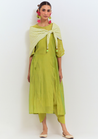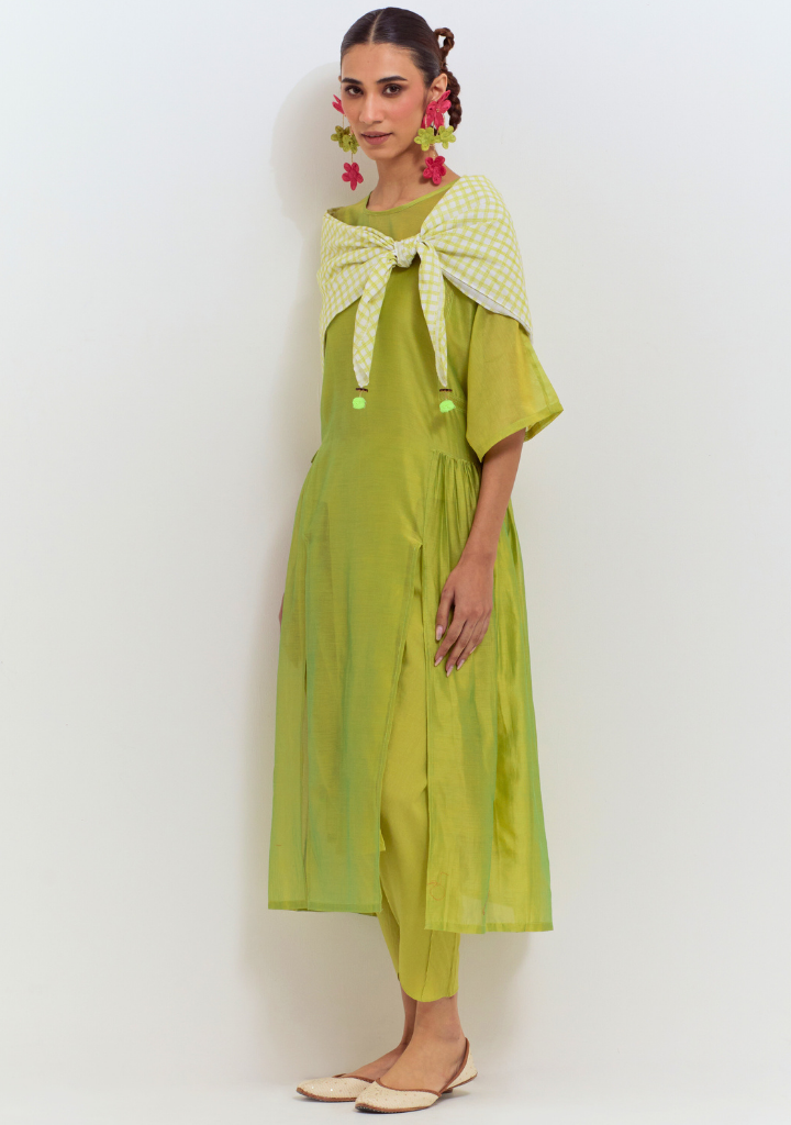 A two piece set pairing the Sun Kissed Kurta and the Sun Kissed Dhoti. The A-line kurta with gather details features a round neck, wide sleeves and side slits. Comes with a detachable pocket. Length 47”. Made in Chanderi silk. Comes with a slip. The Dhoti pants feature an elasticated waist. Length 36”. Made in 100% cotton.