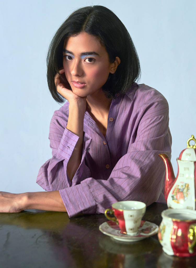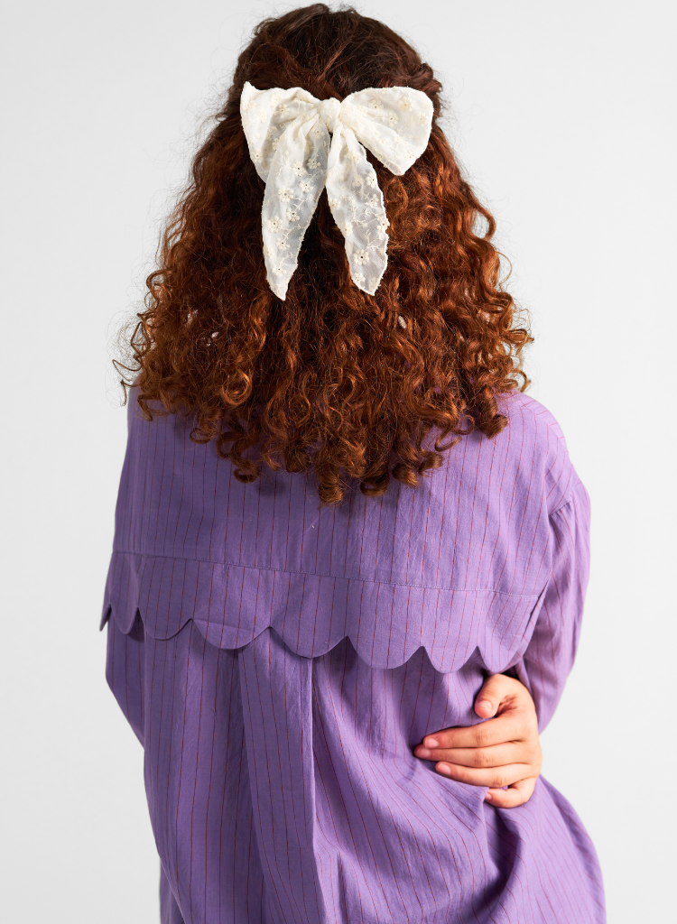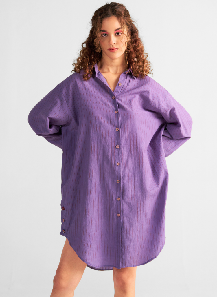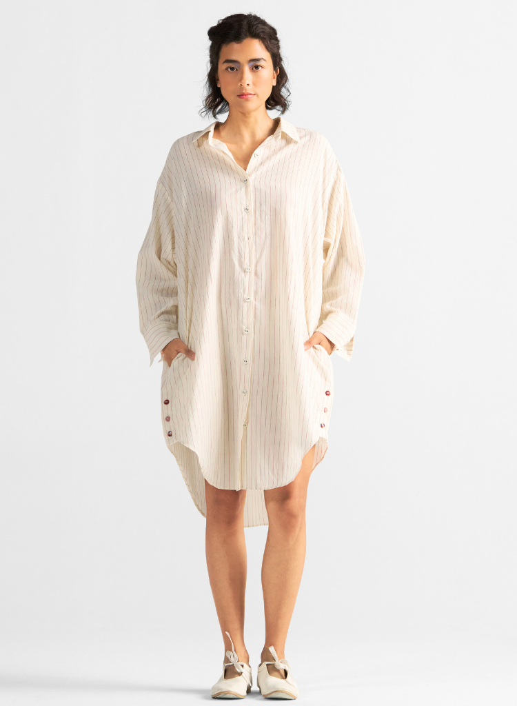 An oversized breezy shirt dress with signature scalloped back yoke featuring a curved hem and long cuffed sleeves. Front length 37", Back length 39". The model is 5'6" and is wearing a size XS.