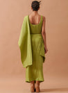 A fitted crop top with hand-sewn pleats and wide shoulder stripes featuring a scoop neckline and a side-concealed zipper fastening. Length 14". The model is 5'8" and is wearing size S.