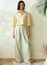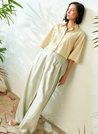 A two-piece set pairing Sunglow Shirt and a high waisted pants. The button down shirt features delicate smocking detail on the front, pleats at the back and 3/4th sleeves. Length 19". The high waisted pants feature a fitted waist, side pleats and inseam pockets. Length 40". The model is 5'8 and wearing a size S.