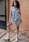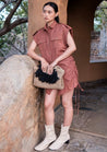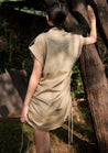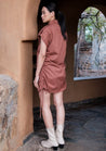 A mini shirt dress with drawstring gathers on the side, folded armhole with buttoned shoulder flap and flap patch pockets featuring button-down front opening and a camp collar. The model is 5'7", and is wearing size S.