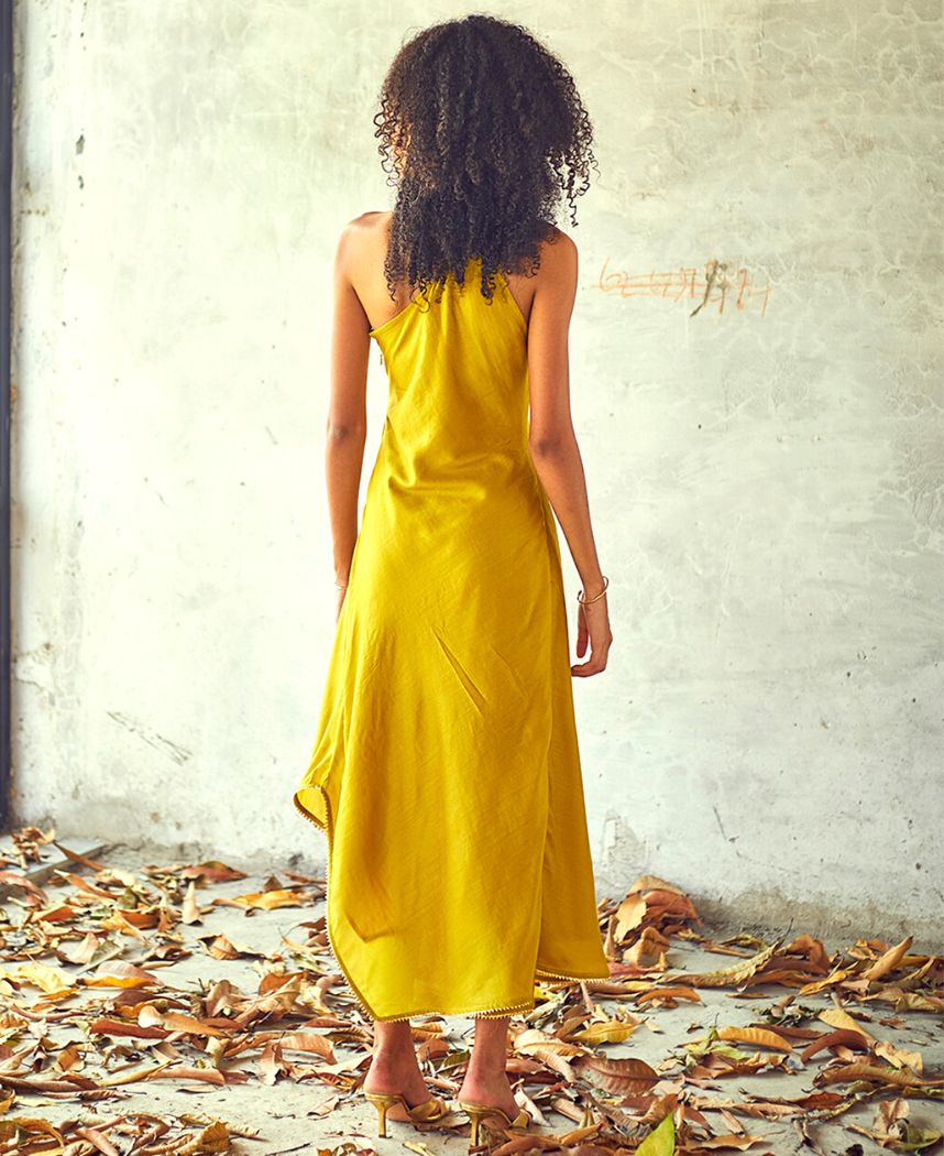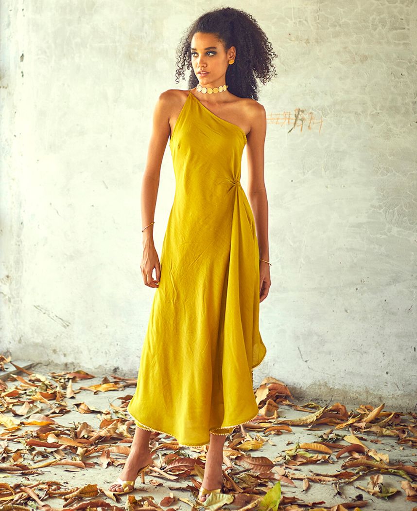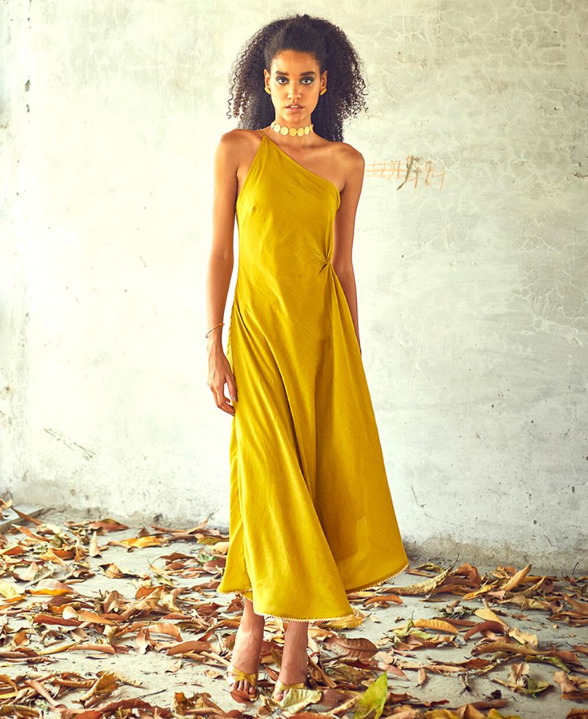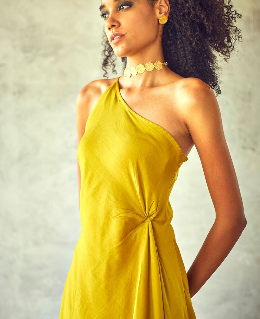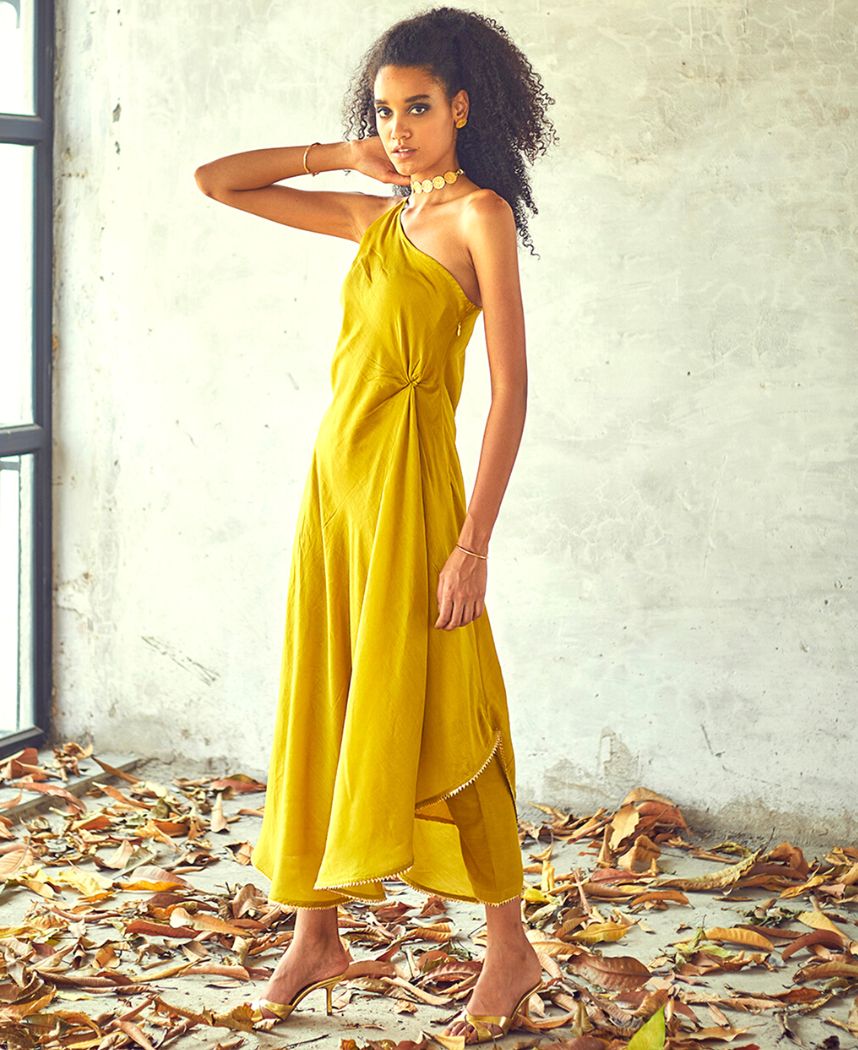 A two-piece set pairing a solid tunic and pants with Gota details. The asymmetrical tunic with Gota details on the hem features a one-shoulder and a ruched pleat on one side. Length 52". Made in cotton silk. The pencil pants with Gota details on the hem feature an elasticated waist belt. Length 36". Made in cotton.
