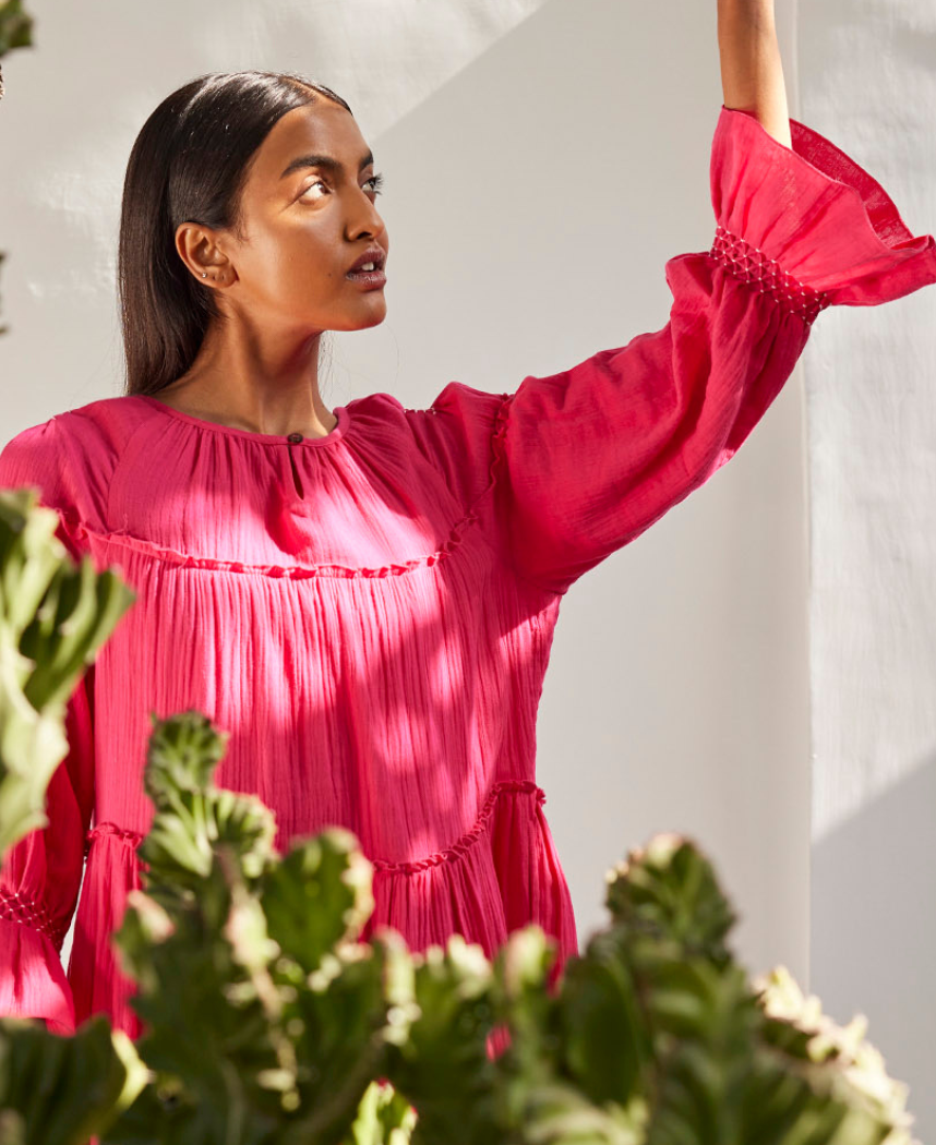 A tiered mini dress featuring a single front button opening, smocking detailing at the sleeves and shoulders and inseam pockets. Length 35". The model is 5'8" and is wearing size S.