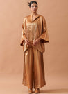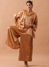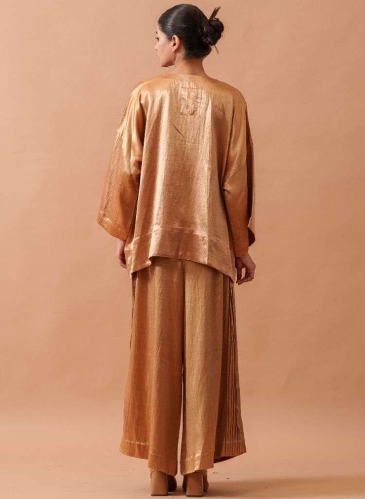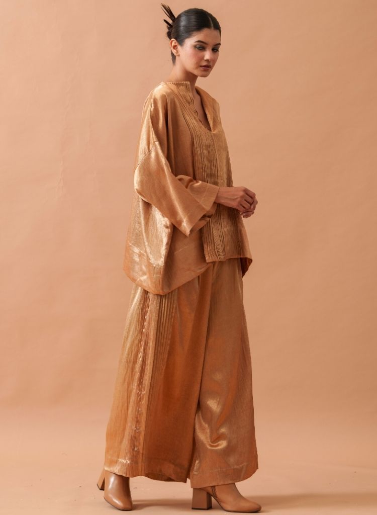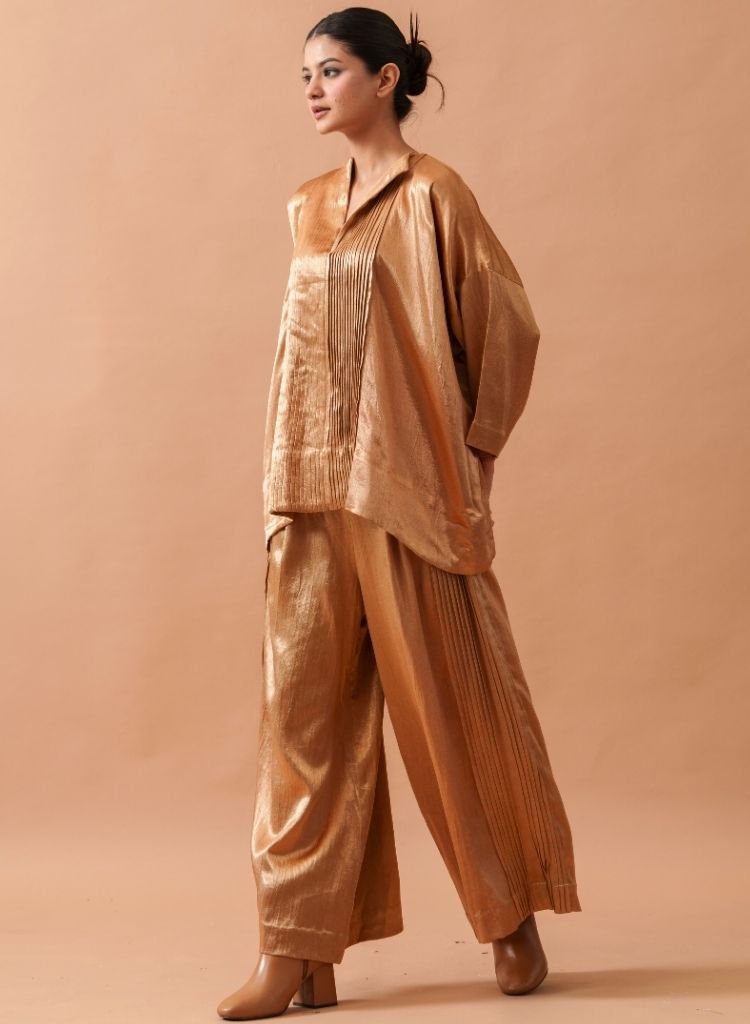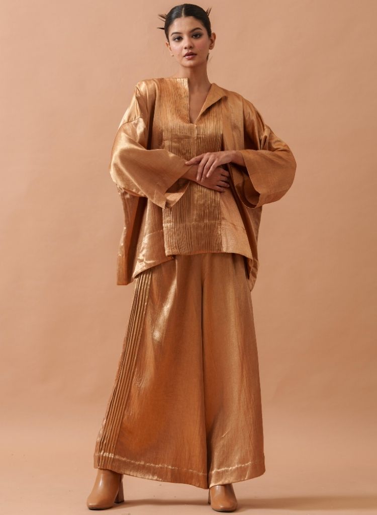 A relaxed-fitting pair of pants with a wide-leg pattern and intricate pleats on the side featuring an elasticated waistband. Length 37". The model is 5'8" and is wearing size S.
