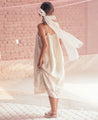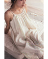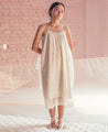 A relaxed gathered slip dress with delicate hand block printed flowers and a lace hem. Length 42". The model is 5'6" and is wearing size S. Made in handspun handwoven cotton silk with cotton lining.