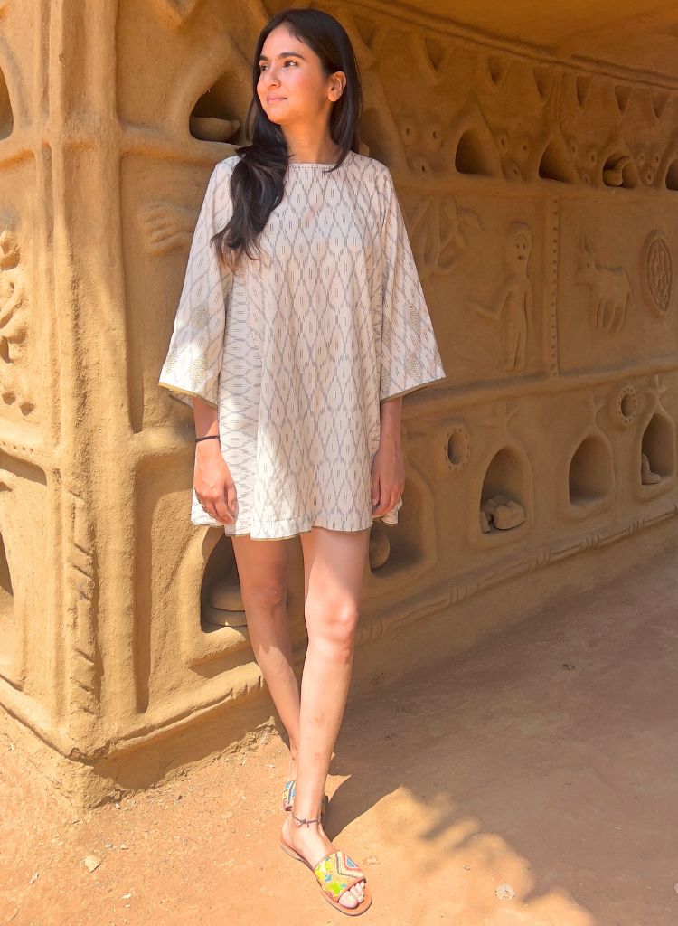 A mini Ikat swing dressfeaturing a closed neck, kimono sleeves and a back opening. Length 34".