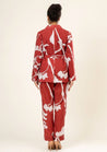 A printed jacket with a lapel collar and long sleeves featuring slash pockets and a tie-up belt. Length 28". The model is 5'7" and is wearing size S.