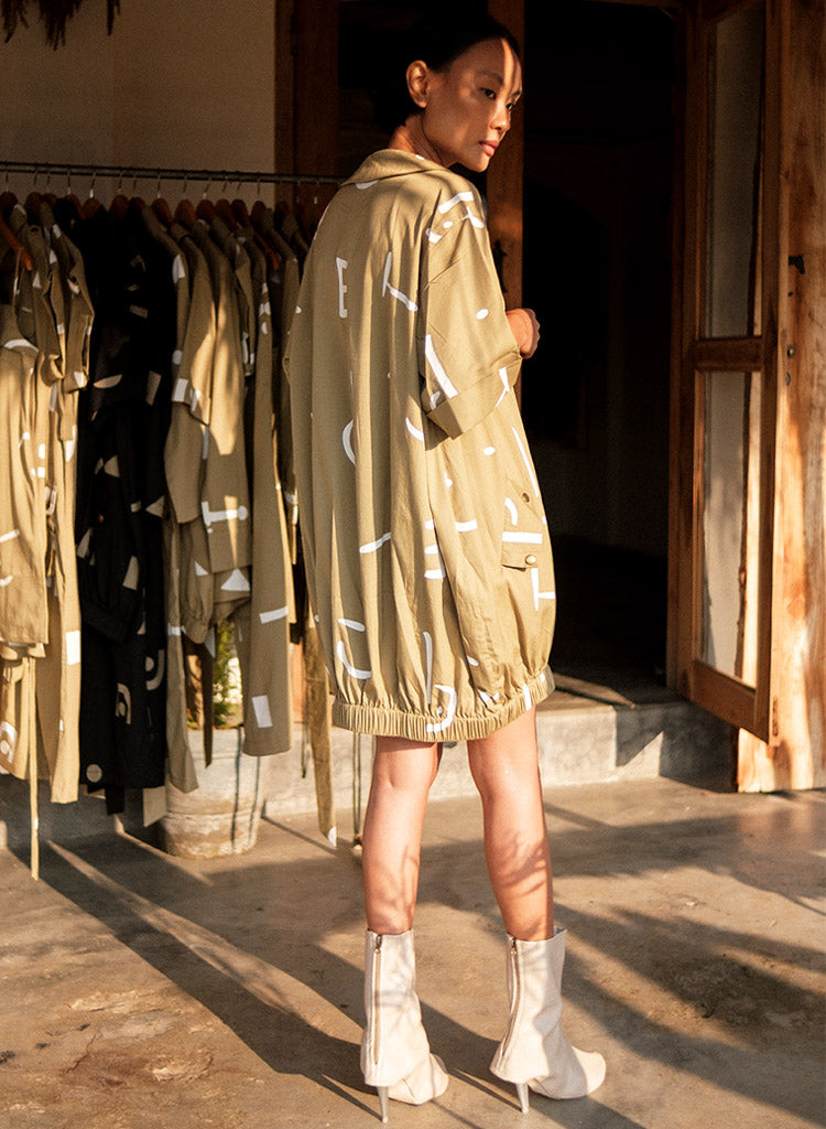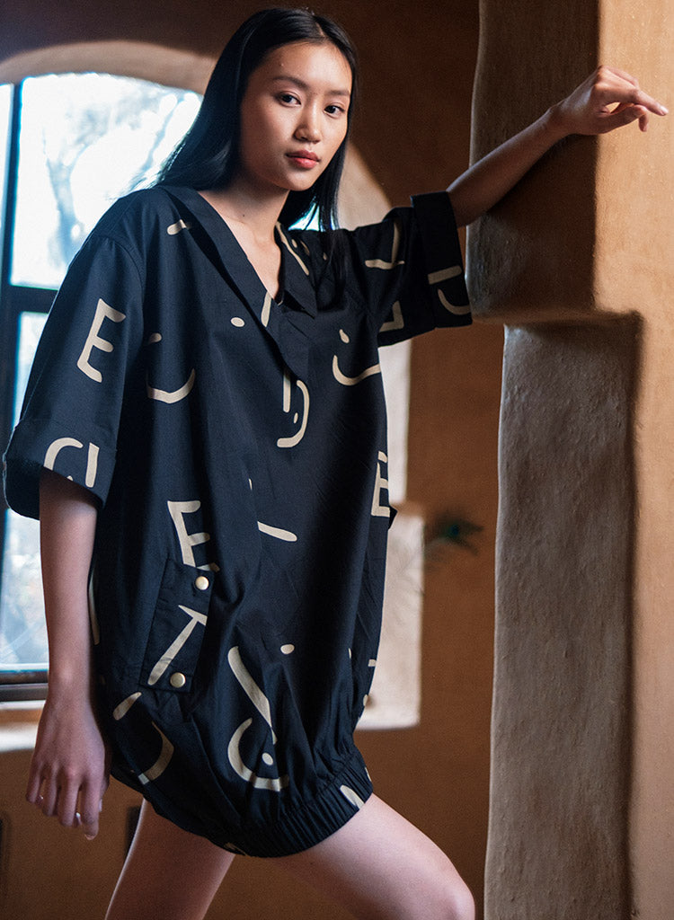An oversized mini-shift dress with a stylized asymmetrical collar and an elasticated hem featuring side pockets with button details, a V-neckline and 3/4 sleeves. Length 30" - 36". The model is 5'7", and is wearing size S.