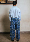 A pair of curved pants with an ikat print featuring a drawstring on the waist. Length 39.5". The women model is 5'4" and the men model is 5'8". Both are wearing a size S.