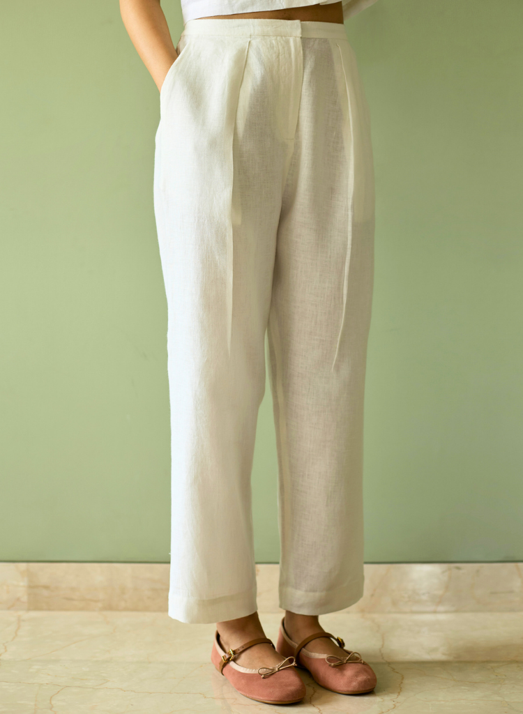 A pair of relaxed tailored pleated pants crafted in soft ivory linen with a front zipper, hook opening, pockets, an elasticated back waistband for comfortable fit.The model is 5'8" and is wearing a size XS.