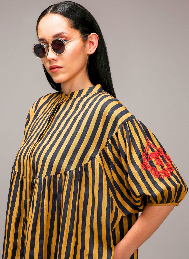 A loose, comfortable kaftan-style tunic with hand-block printed stripes and beautifully hand-embroidered sleeves with joker thread work. Features a front button opening and handy side pockets. Length 36".
