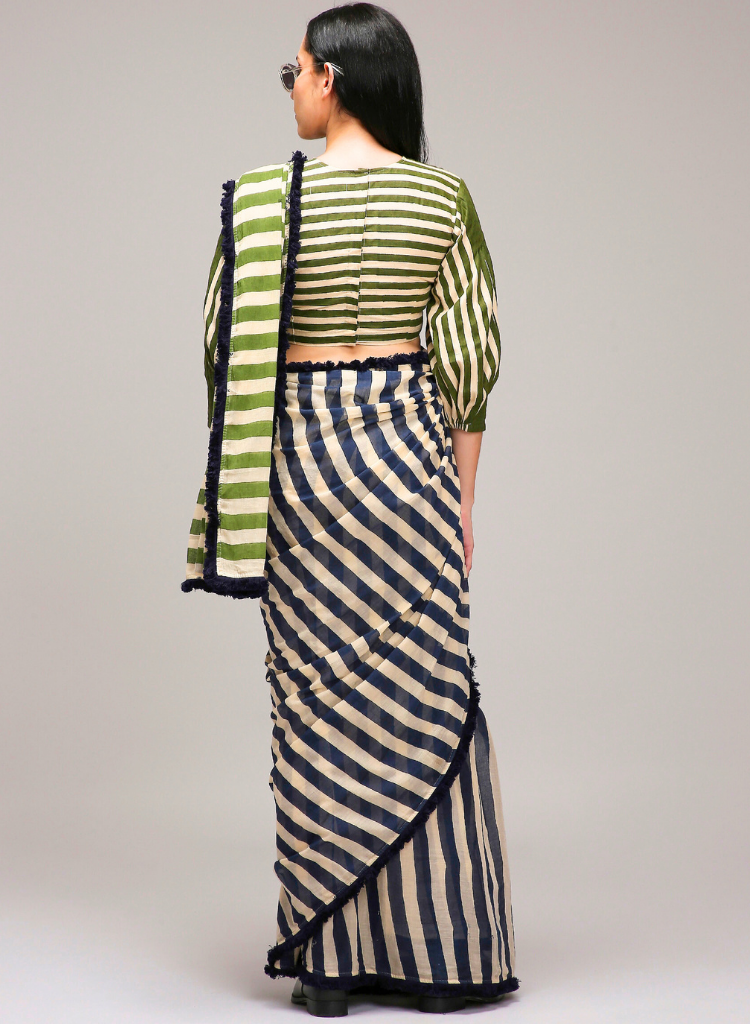 A two-piece set pairing the Dual Stripe Saree and matching crop top. The lightweight saree features hand-blocked stripes in a striking dual-colour combination and delicate tassel detailing throughout. The crop top features pleated detailing at the upper and lower sleeves, along with elasticated hems for added shape and style. Length 15.5".