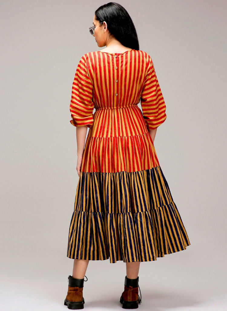 A tiered maxi dress with beautiful hand block prints. Features a dual-colour, two handy pockets and a full back opening for easy wear. Length 51".