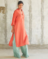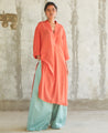 A lightweight coral tunic with a shawl V-neck and side slits. Length 44". The model is 5'5" and is wearing size S.