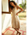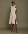 A simple A-line dress with side slits. Features V-neck, a back button and side pockets. Length 39" - 43" based on size. The model is wearing XS.