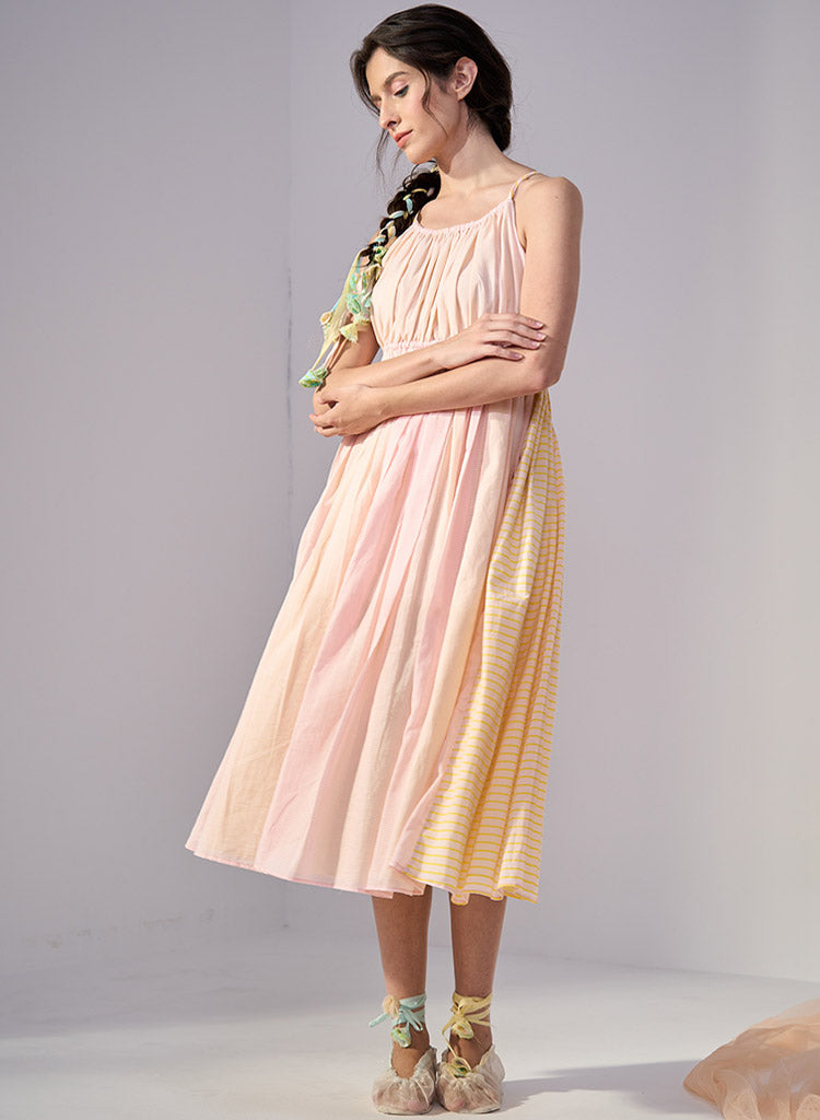 A hand-printed fit and flare midi dress with stripes featuring a wide neck, an elasticated waist and cross-back straps. Length 48". The model is 5'9" and is wearing a size S.