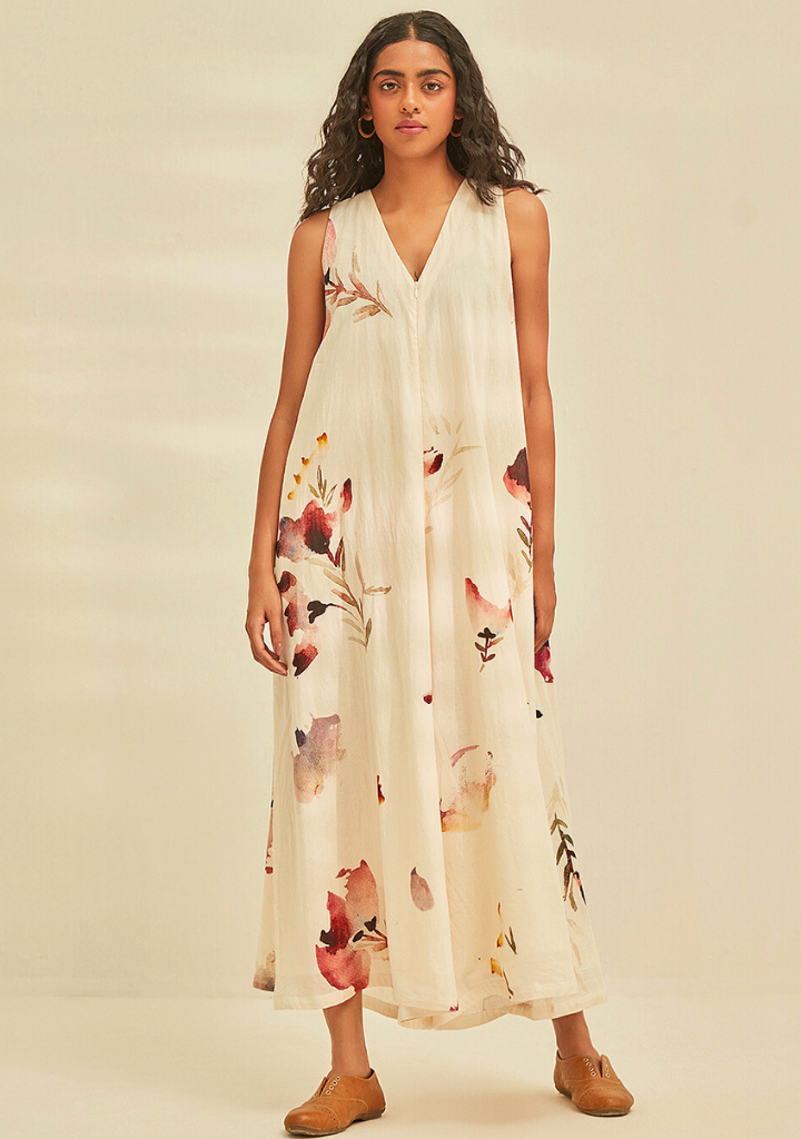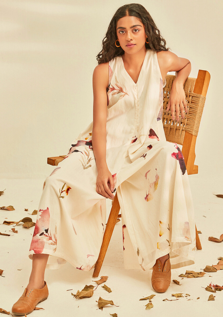 A floral printed flared-leg jumpsuit featuring a V-neck, zipper opening and inseam pockets. Length 51".The model is 5'7.5" and is wearing a size S.