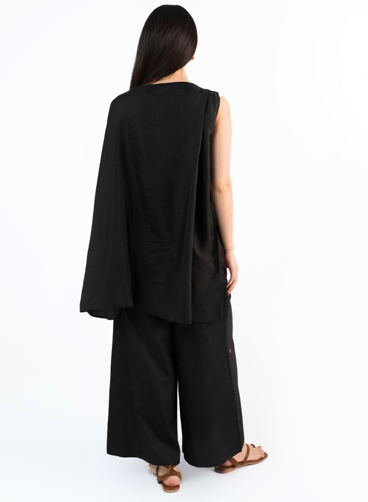 A two-piece set pairing the Teri Silk Top and the Teri Silk Pants. The asymmetrical kimono top adorned with starry hand-embroidery, sleeveless on one side and flowing into a graceful half sleeve on the other. Length 29". The matching wide leg pants feature a fitted waist and inseam pockets. Length 41". The model is 5'8", and is wearing size S.