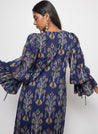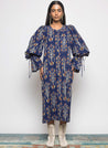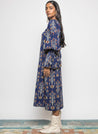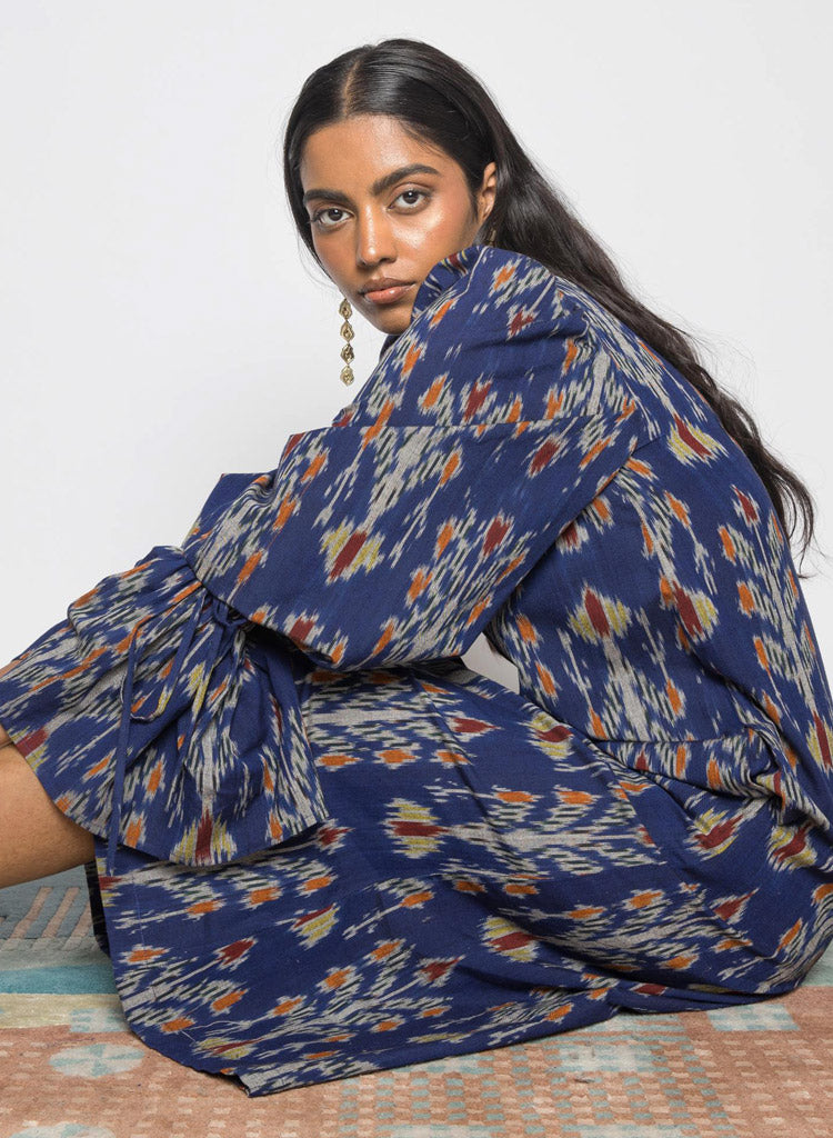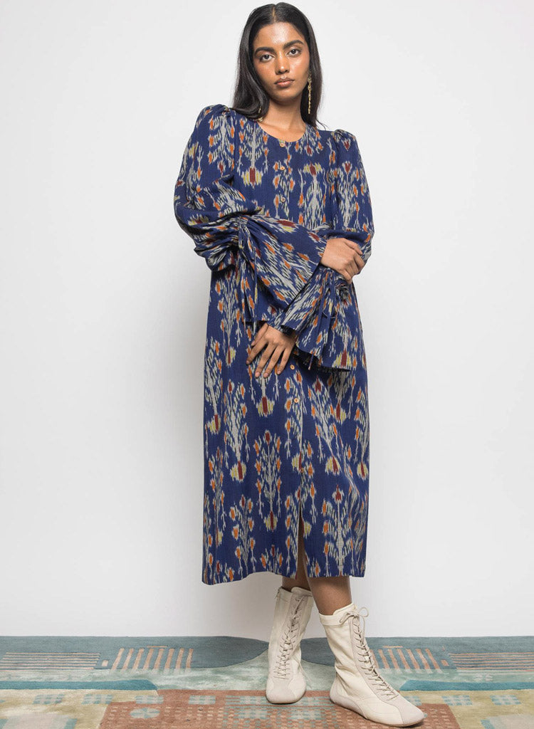 A button down midi dress with oversized sleeves featuring a round neck and inseam pockets. The model is 5'8" and is wearing a size XS.