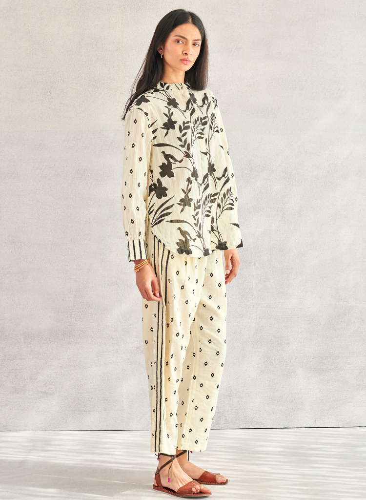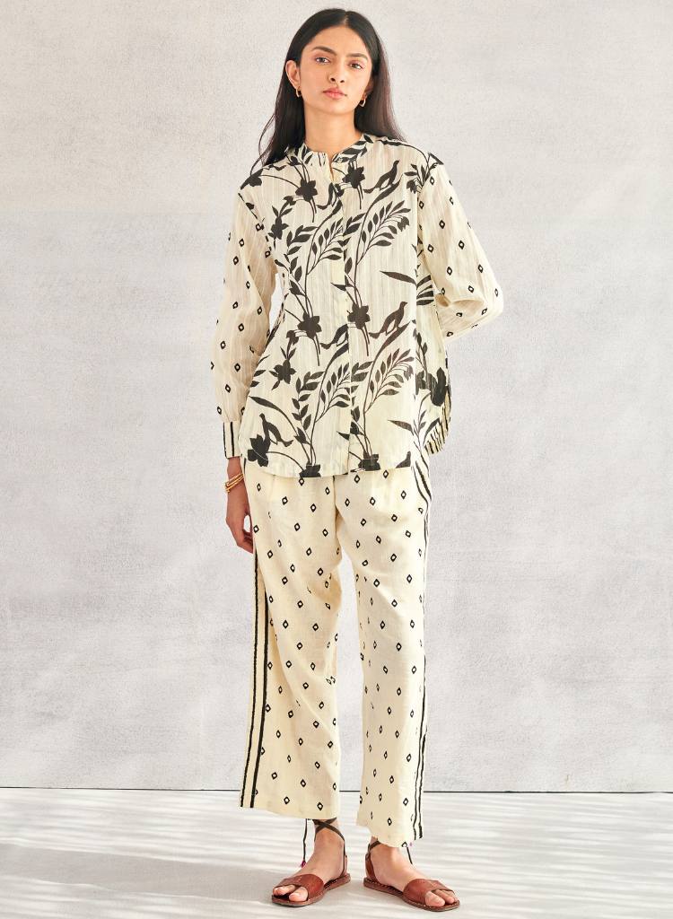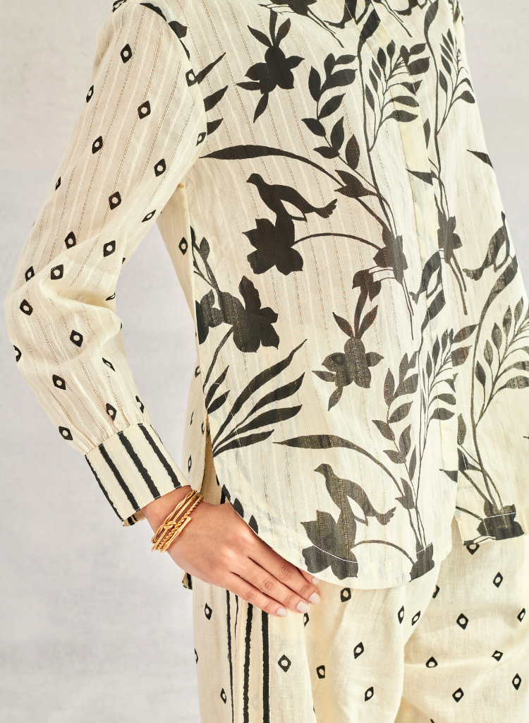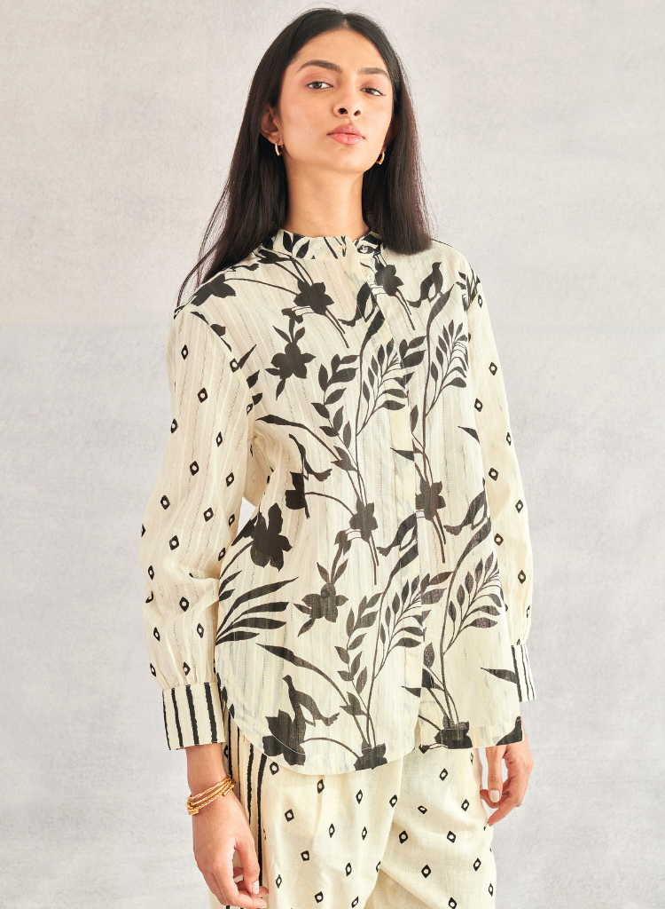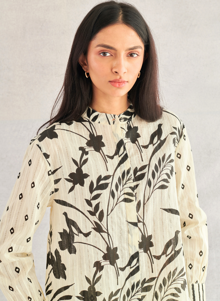 A relaxed fitting shirt with a striking blend of geometric and tropical monochrome prints. Features a band collar, a concealed placket and a rounded hem. The model is 5'9" and is wearing a size S.