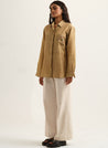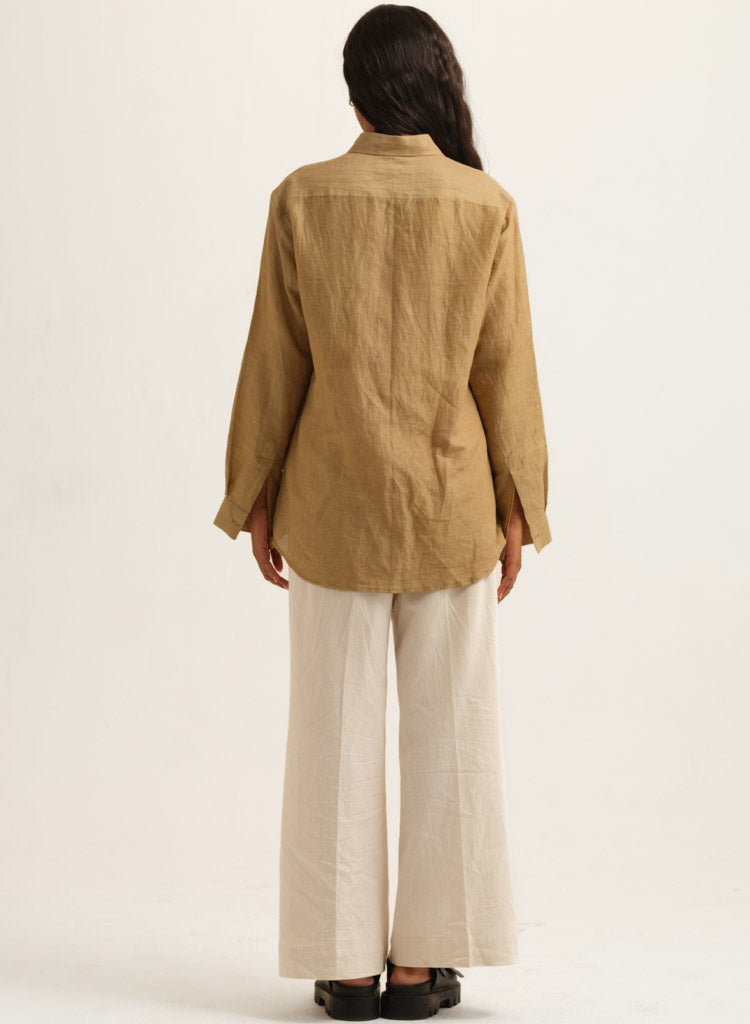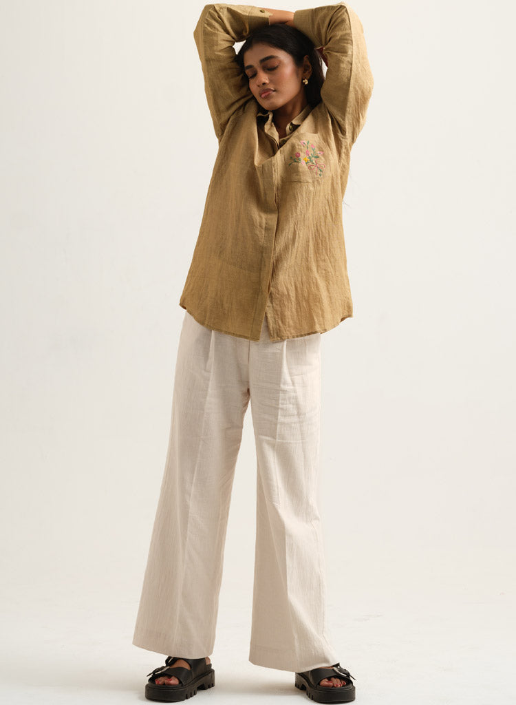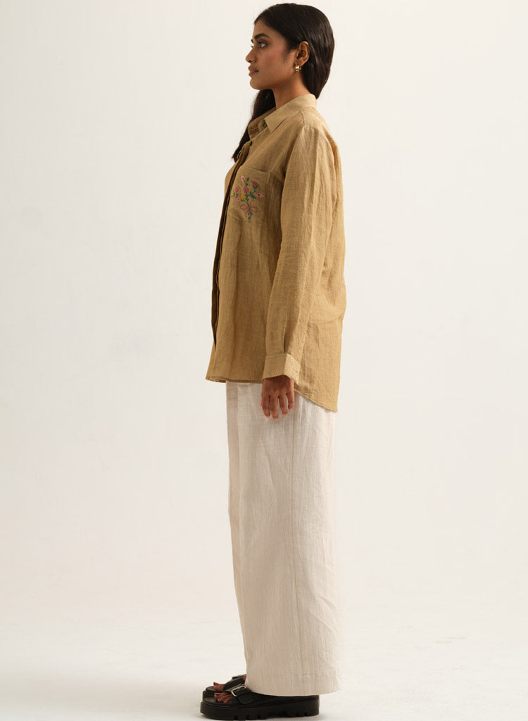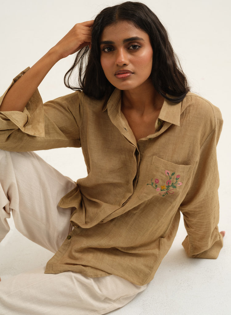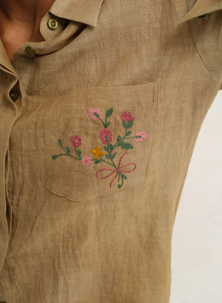 A unisex shirt featuring a hand embroidered pocket and a front button placket. Length 27". The model is 5'5" and is wearing size S.