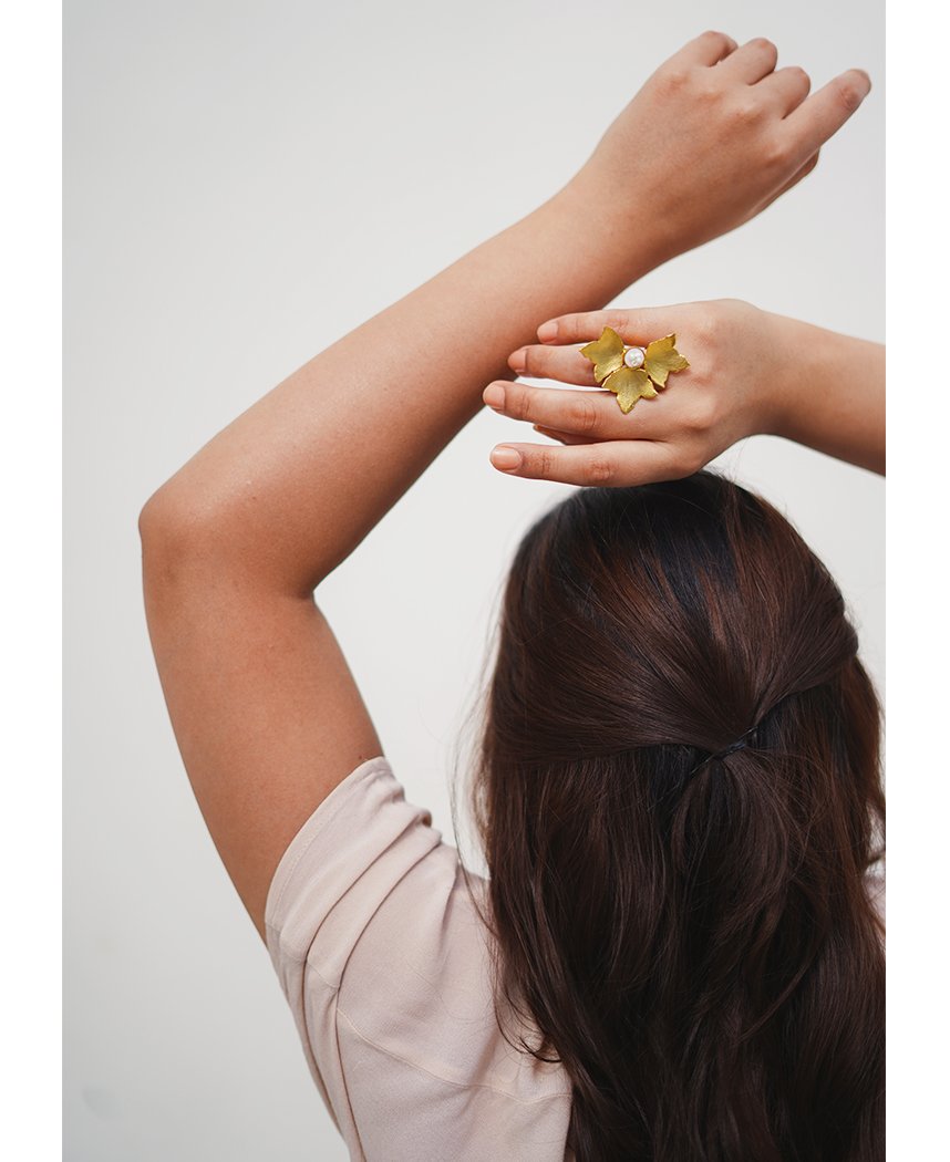 A formation of three petals joined by a piece of fabric embellished by beads. Size is adjustable. Handcrafted in brass.