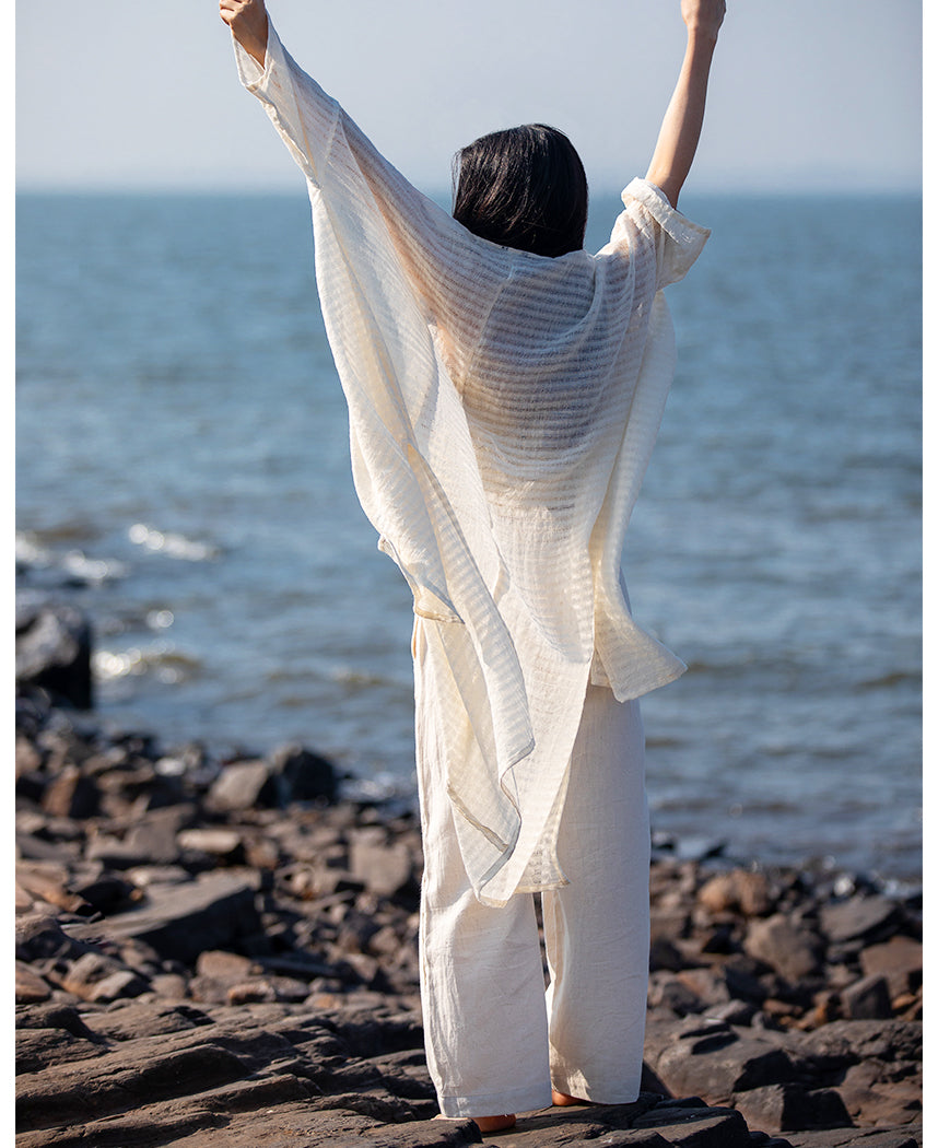 A light open front overlay with self-textured stripes. Features side slits and kimono sleeves. Front length 31.5", Back length 42". Comes in a free size and fits XS-2X. The model is 5'5".