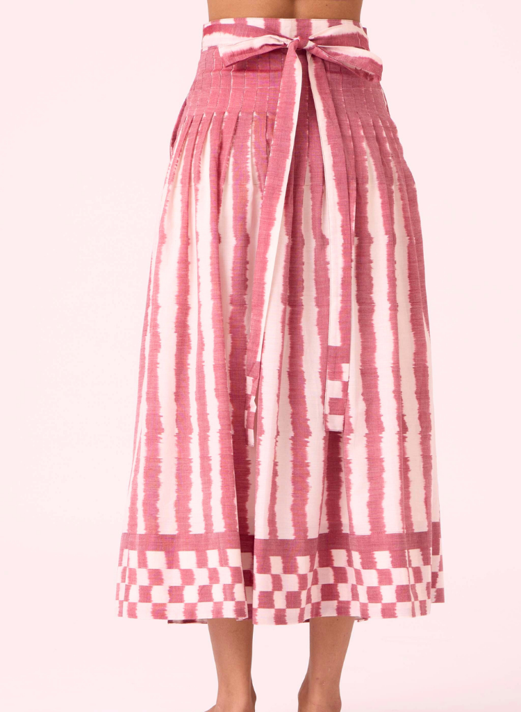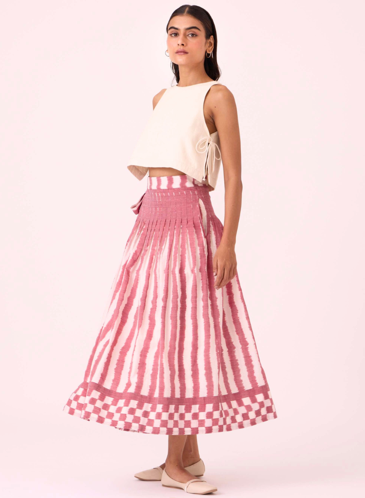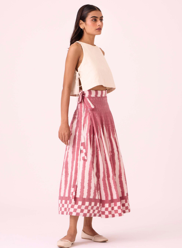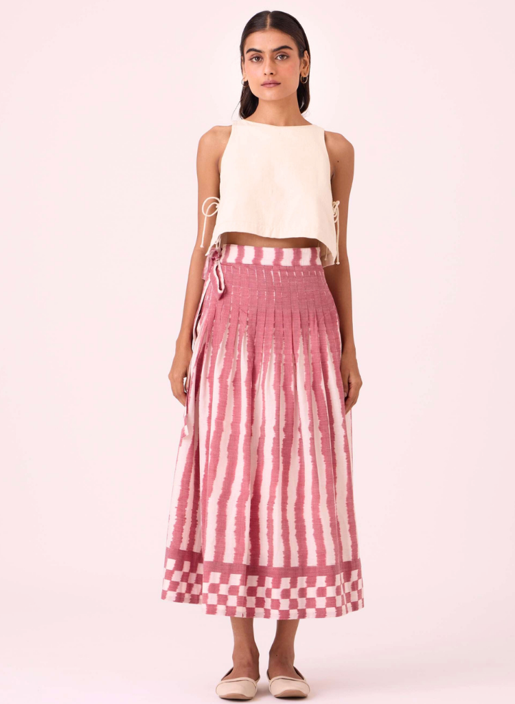 A two-piece set pairing the Tia Tie Top and the Levin Skirt. The cropped vest features a round neck and side tie fastenings. The pleated wrap skirt features a fitted waist and in-seam pockets. Lined. The model is 5'6" and is wearing size XS.