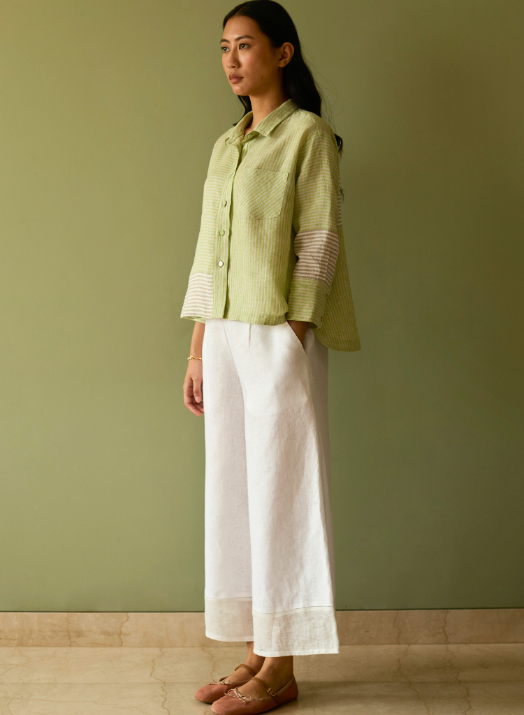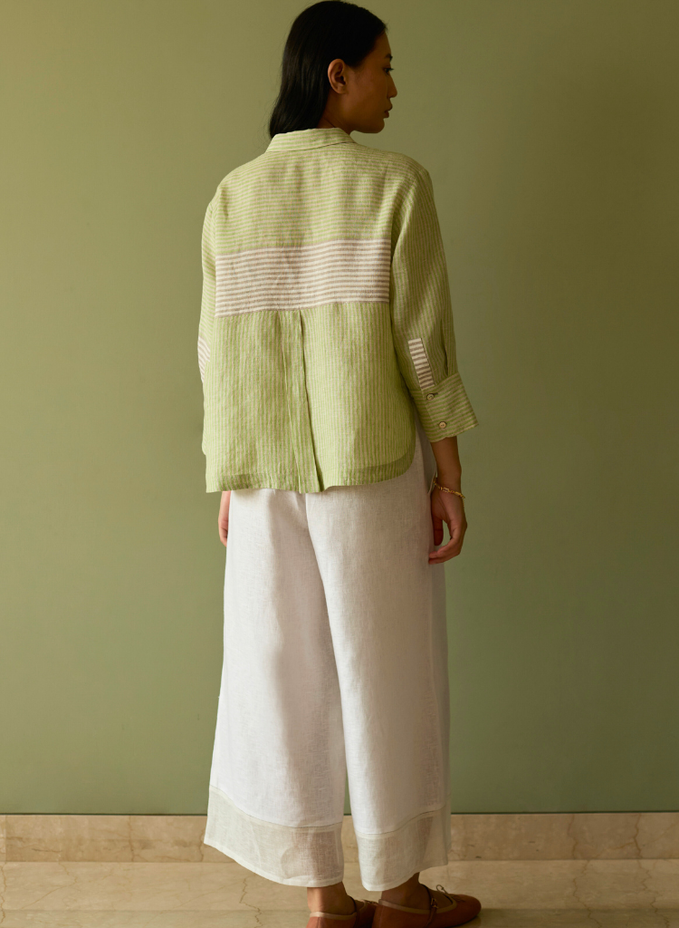 This chic & contemporary colour-blocked shirt is crafted using handwoven yarn-dyed soft stripe linen in tones of green, grey and ivory. The weave is a delicate, and unique multicolour stripe handwoven linen that is statement, yet balanced. The cropped shirt is sharp yet relaxed, featuring a clean button-down placket with 3/4th sleeves and thoughtfully placed border details on the front hem, sleeves and back. The shirt is finished with a mix of linen fabric and luminous mother-of-pearl buttons. The model is 5'8" and is wearing a size XS.