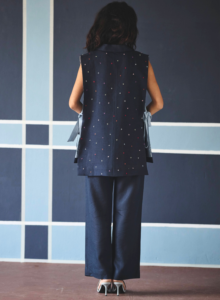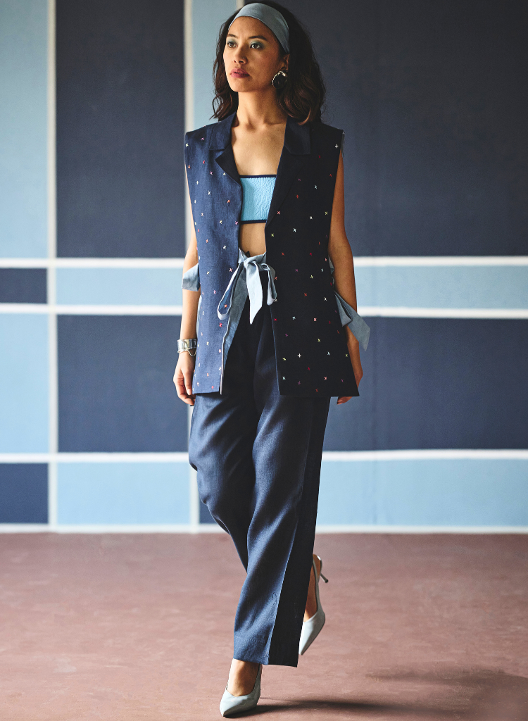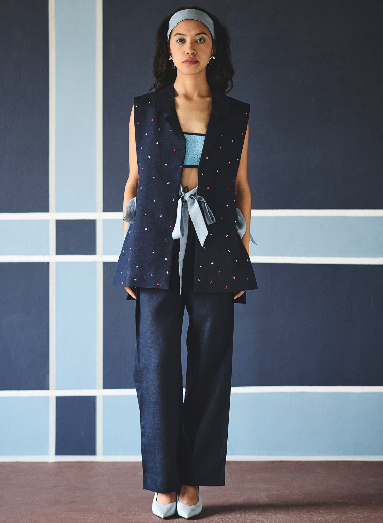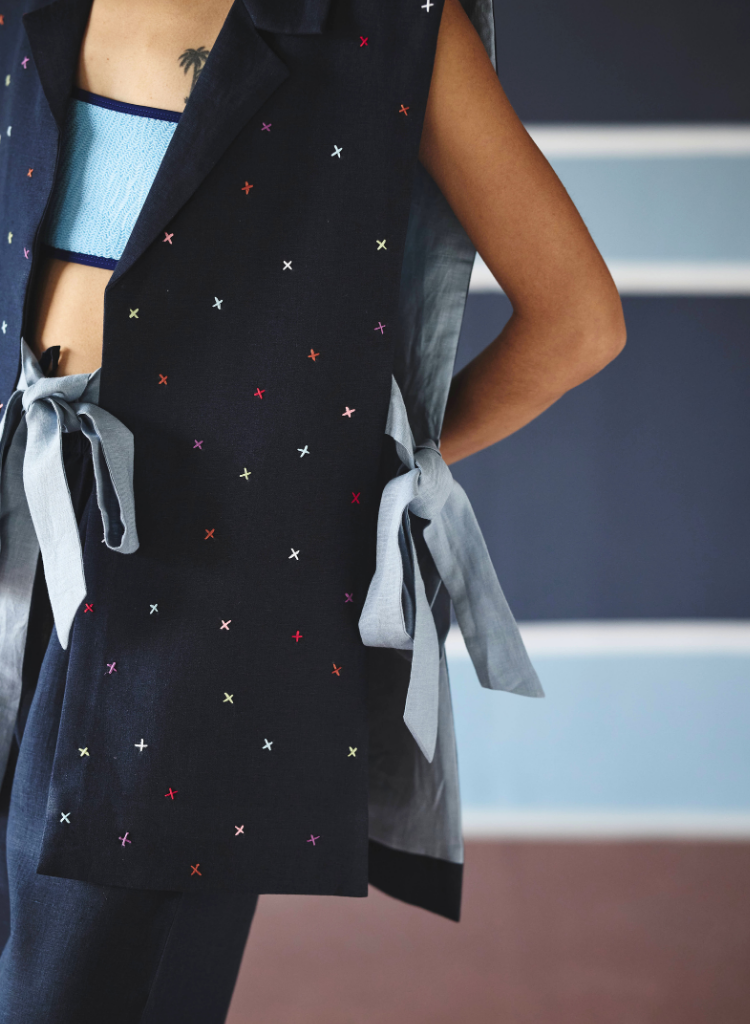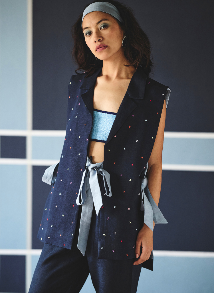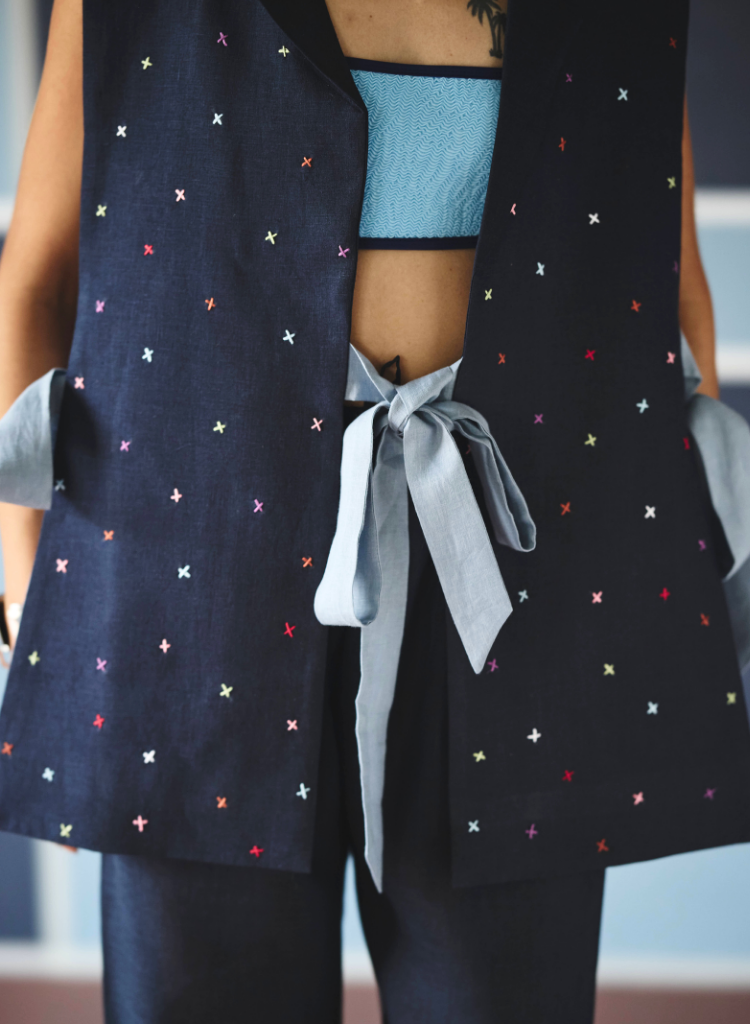 A front open jackets with a side open tie-up featuring hand-embroidered multicolour cross-stitch details. Length 29". The model is 5'9” and is wearing size S.