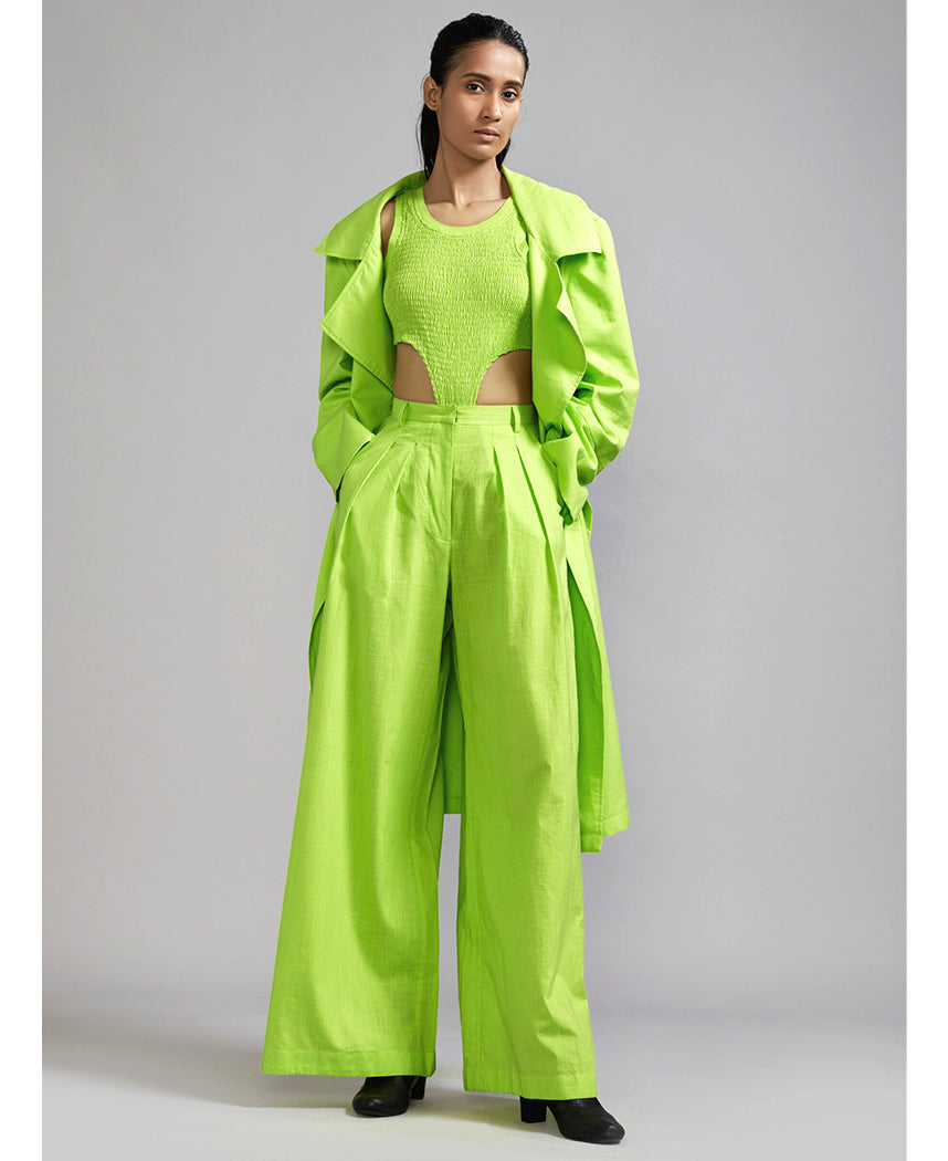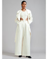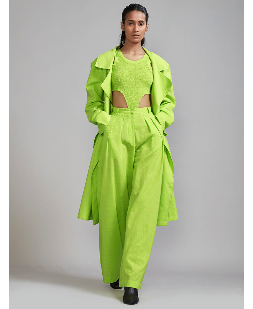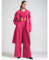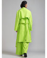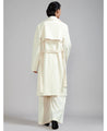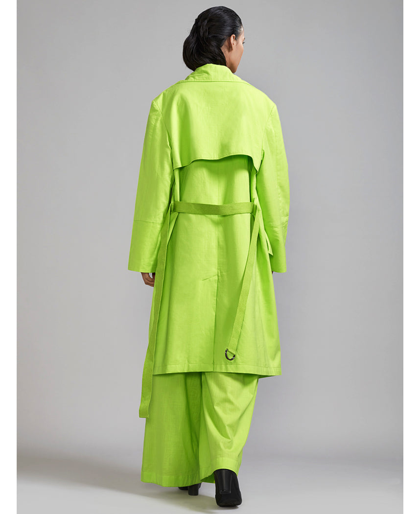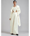 A classic trench jacket with a wide lapel collar and long sleeves featuring side pockets and a canvas belt. Length 41". The model is 5'9" and is wearing size XS.
