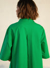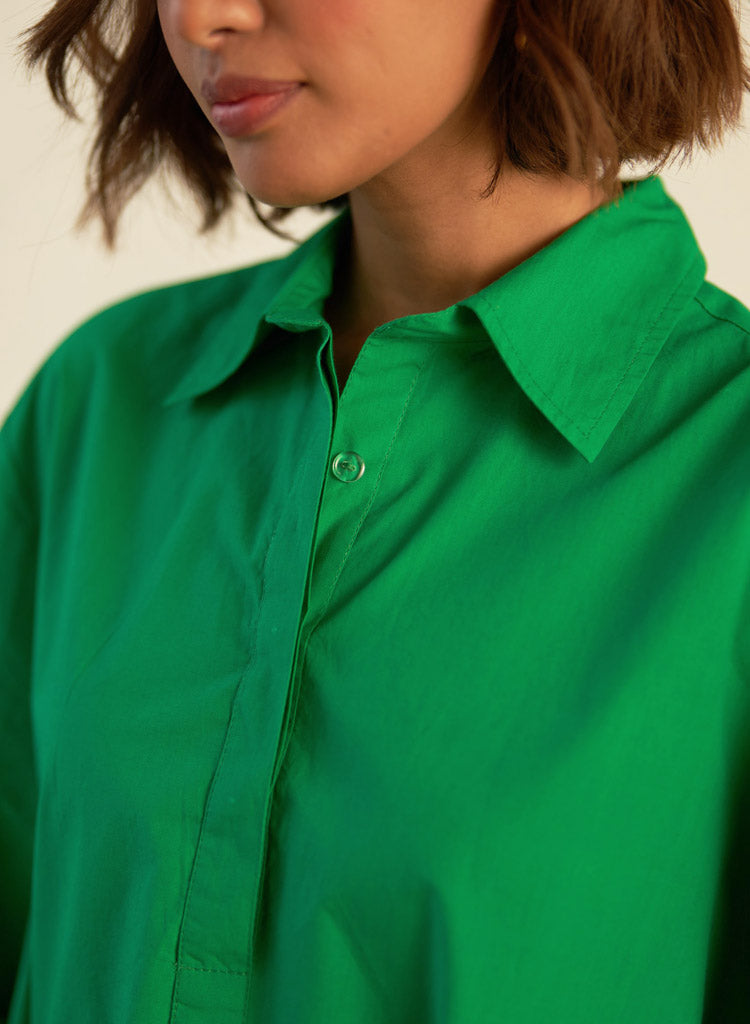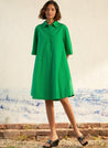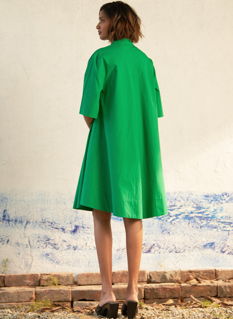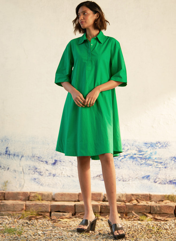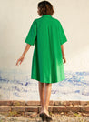 A flowy mini dress with elbow-length sleeves and an A-line hem. The added volume in the flare enhances its dramatic effect, while the pointed collar, concealed half-placket, and tonal buttons offer refined elegance. Length 37". The model is 5'9" and is wearing size S.