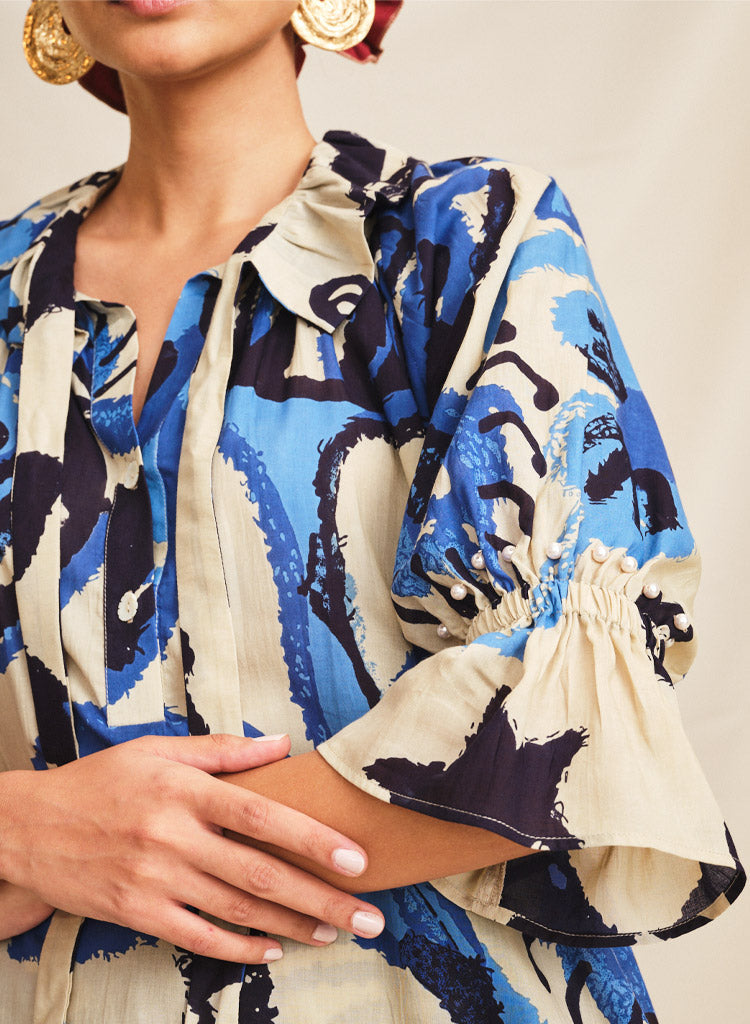 A two-piece set pairing the Tulika Blouse and the Tulika Trousers. Inspired by the fluidity of hand-painted strokes, this printed blouse is crafted from lightweight modal fabric, which offers a loose, relaxed fit for all-day comfort. It’s meticulously hand-screen printed with a delicate pearl embroidery on the sleeve that adds a charming detail. Length 27". Handcrafted in approx 3 meters of modal sourced from Jaipur have been used for this piece. The matching printed trousers feature a wide-leg pattern with a loose, relaxed fit. Length 43". The model is 5'8" and is wearing a size S.