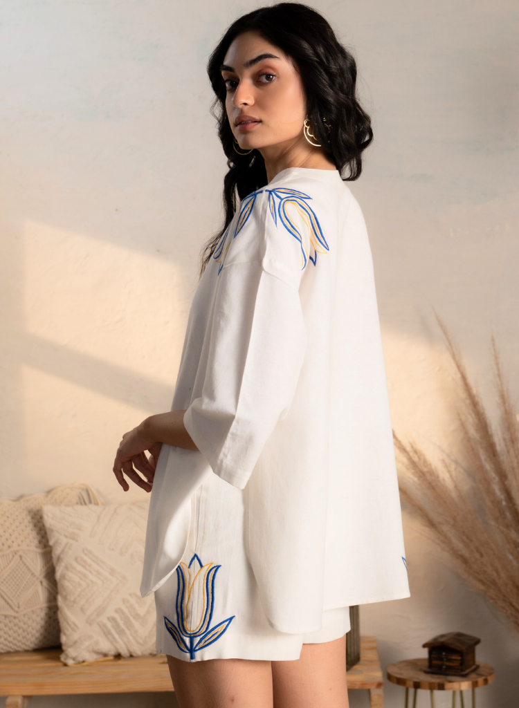 A two piece set pairing the Tulip Mist Shirt and matching shorts, both hand embroidered. The relaxed fitting shirt with side slits features a V neck, a half button placket and shell button detailing. Length 28". The matching high waisted shorts feature a fitted waist with a button closure, inseam pockets and a back pocket. Length 15". The model is 5'9" and is wearing size S.