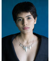 A bib shaped necklace featuring petal shaped pieces inspired by traditional Kutchi and Tibetan jewelry. Made in 92.5 silver. Dimension : 21 cm x 10 cm.