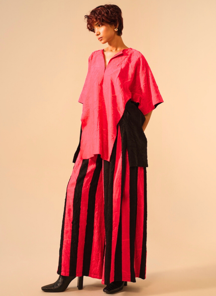 A pair of flared trousers featuring delicate hand-sewn pleats, finished with a full belt and zip closure for a seamless fit. Length 38". The model is 5'8" and is wearing S.