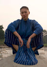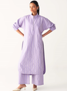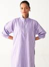 A striped tunic with a contrast U-yoke featuring a high neck with a zipper, curved high low hem and side pockets.