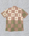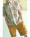 An upcycled mahjong tile shirt with checkered hand embroidery details featuring dual tone horn buttons and a shirt collar with short sleeves. Length 29". The model is 6'1" and is wearing a size S.