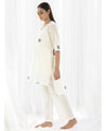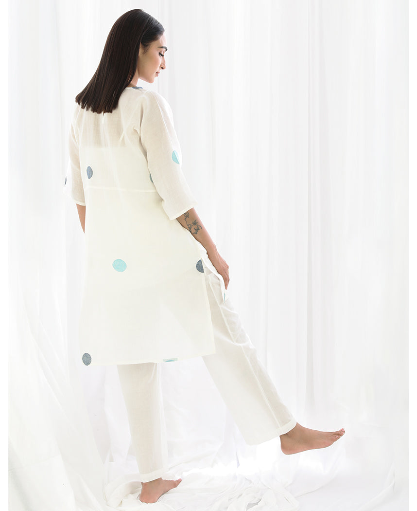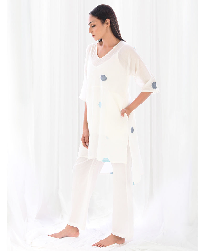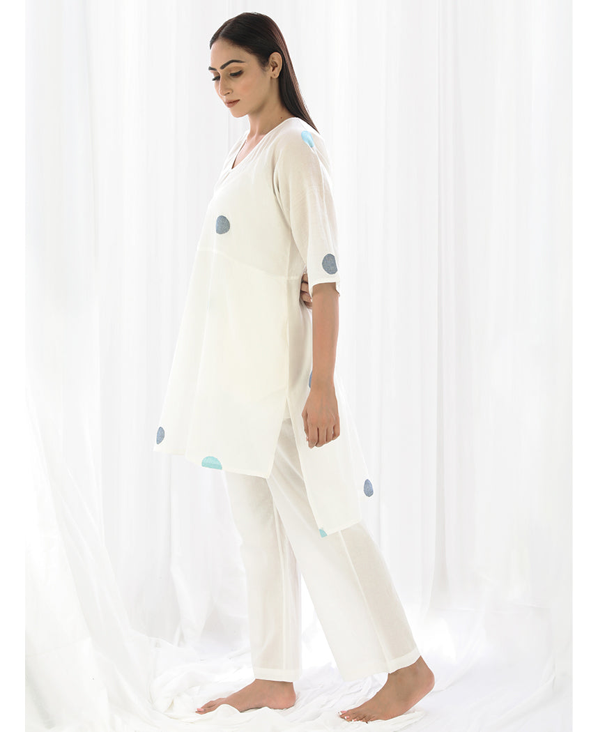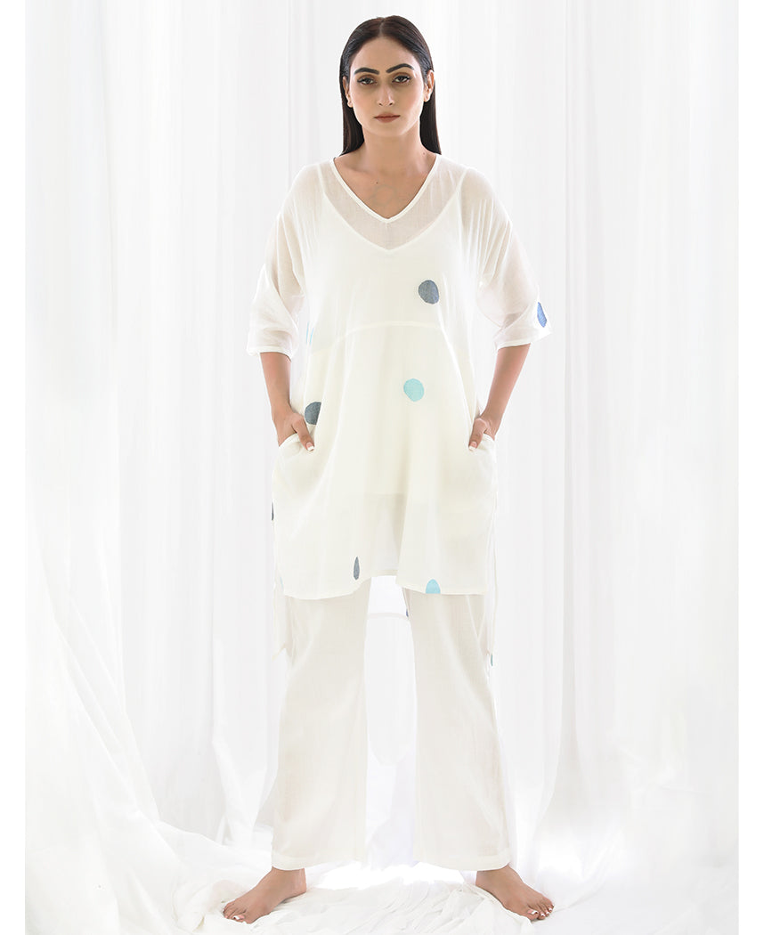 A relaxed polka dot tunic with a high low hem and side slits. Made in handwoven cotton. Features a V-neck and inseam pockets. Comes with a short slip. Front length 33", Back length 38".