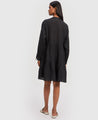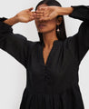 A solid tiered dress featuring a mandarin collar, a front button placket, cuffed sleeves and inseam pockets. Length 35". Made in hemp.