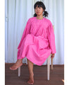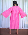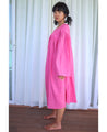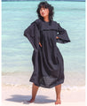 A gathered midi dress with flared sleeves featuring a round neck. Length 45". The model is 5'7" and is wearing a size M.